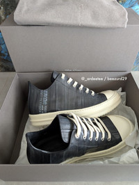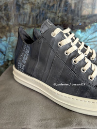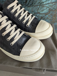 RICK OWENS :: 1 OF 1 SAMPLE LEATHER & RUBBER RAMONES LOW SNEAKERS :: BLACK/MILK * BRAND NEW W/ DUSTBAG AND BOX * Incredible 1 of 1 sample from FW24 Porterville Made in collaboration with Matisse Di Maggio Outer is constructed using recycled black rubber tires (the Hooded Peter jacket from this capsule was $9,000+) The intended irregularity of the material means that no two products are exactly alike, giving each its individual uniqueness. Any irregular surface texture, color variations, prints, markings, or holes are not imperfections or defects; they are the tactile and visual aspects specifically desired by Rick Owens. Leather lining and insole Item: RO02D3891-TYR Sample pair so only has the size embossed Color: Black/Milk Made in Italy TAGGED SIZE 41 EU Insole 11.6" -------------------------- 👉Faster shipping options available! @_ardeetee 👉Purchased items shipped out next asap 👉Please ignore the grailed US sizing and refer to the designer indicated size and measurements 👉All my items are BRAND NEW unless otherwise indicated 👉NO TRADES, holds, returns/exchanges. Appreciate your understanding!