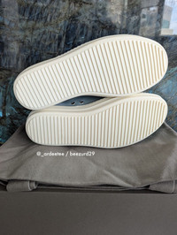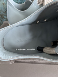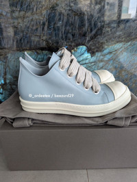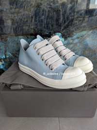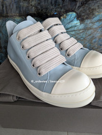 RICK OWENS :: RARE SAMPLE FW24 LEATHER JUMBO LACE RAMONES LOW SNEAKERS :: PALE BLUE * BRAND NEW IN BOX W/ TOTE BAG * Very rarely seen available in Men's sizes! Beautiful leather jumbo lace low ramones from Rick Owens FW24 Porterville Calfskin leather upper and jumbo laces with a treaded rubber sole Item: RU02D6893-LCOW2 Sample pair so only has the size embossed on inside Color: Pale Blue/Milk Made in Italy TAGGED SIZE 44 EU Insole 11.6" -------------------------- 👉Faster shipping options available! @_ardeetee 👉Purchased items shipped out next asap 👉Please ignore the grailed US sizing and refer to the designer indicated size and measurements 👉All my items are BRAND NEW unless otherwise indicated 👉NO TRADES, holds, returns/exchanges. Appreciate your understanding!