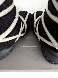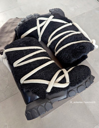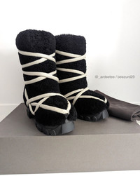 RICK OWENS :: FW22 SHEARLING LUNAR TRACTOR BOOTS :: BLACK/BLACK * BRAND NEW W/ DUSTBAG AND BOX * Rare black w/ black sole Black/Black Shearling Lunar Tractor Boots from FW22 BLACK PALINORO LAMB SHEARLING Wide padded upper with an angular heel counter and jumbo laces that criss-cross the foot in a pentagram shape. This shearling lamb leather has a soft shaved fur and a natural wax nappa finish. Tanned in the tuscan area of Italy, these shearling merino hides are of Australian origin, the unique thick fur of these animals make them perfect for shearling. Item RU02B2889-LSHPW1 Color: Black/Black Material: Upper 100% lamb shearling real fur Back detail 100% calf leather, leg lining 100% nylon Made in Italy TAGGED SIZE 42 EU Insole 11.5" -------------------------- 👉Faster shipping options available! @_ardeetee 👉Purchased items shipped out asap 👉Please refer to the designer indicated size and measurements 👉All my items are BRAND NEW unless otherwise indicated 👉NO TRADES, holds, returns/exchanges. Appreciate your understanding!