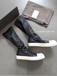 RICK OWENS :: SS24 LEATHER RAMONES SOCK SNEAKERS :: BLACK * BRAND NEW W/ BOX AND TOTE * RICK OWENS SOCKS SNEAKERS IN BLACK STRETCH LAMB LEATHER FEATURE FOLDS AND DRAPES AROUND THE ANKLE, STITCHING DETAILS ALONG AND AROUND THE LEG, A LEATHER PANEL ON THE BACK OF THE HEEL, TOE CAPS AND SHARK-TOOTH SOLES. Item RU01D3895-LS Color: Black Composition: 100% Leather, Sole 100% Rubber Made in Italy TAGGED SIZE 44 EU -------------------------- 👉Faster shipping options available! @_ardeetee 👉Ships out ASAP 👉Please refer to the designer indicated size and measurements 👉All my items are BRAND NEW unless otherwise indicated 👉NO TRADES, holds, returns/exchanges. Appreciate your understanding!