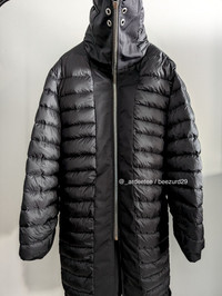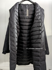 RICK OWENS :: SAMPLE FW22 DOWN PADDED JUMBO GIMP COAT :: BLACK * BRAND NEW W/ TAGS * RARE SAMPLE FW22 Strobe Rick Owens Jumbo Gimp Coat Down lining/internal padding Showroom sample with cotton tags and 0-0-0 product code Technical blend fabric in a shell weave Full zip gimp hood Long sleeves, chest zip pocket Item RR02B2910-MUD1 Color: Black Outer: 53% Nylon, 47% Cotton Padding: 90% Goose Down 10% Duck Down Made in Italy Retails $2,150+ USD TAGGED SIZE 48 EU Shoulders 22" / Pit 28" / Sleeve 28" / Back length 43" -------------------------- 👉Faster shipping options available! @_ardeetee 👉Ships out ASAP 👉Please refer to the designer indicated size and measurements 👉All my items are BRAND NEW unless otherwise indicated 👉NO TRADES, holds, returns/exchanges. Appreciate your understanding!