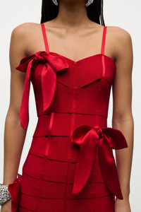 Bandage mini dress with all over bow embellishment. Features adjustable straps and back zipper. Available in Red and Black. - 80% Polyester, 20% Latex - Dry Clean Only - Model is 5'8" and wears a size S