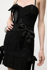 Bandage mini dress with all over bow embellishment. Features adjustable straps and back zipper. Available in Black. - 80% Polyester, 20% Latex - Dry Clean Only - Model is 5'9.5" and wears a size S