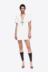 Ponte jersey v-neck t-shirt dress. Features crystal bow detail at front center and crystal trim. Available in White, Pale Pink and Black. - 67% Rayon, 28% Nylon, 5% Elastane - Dry Clean Only - Model is 5'11.5" and wears a size S