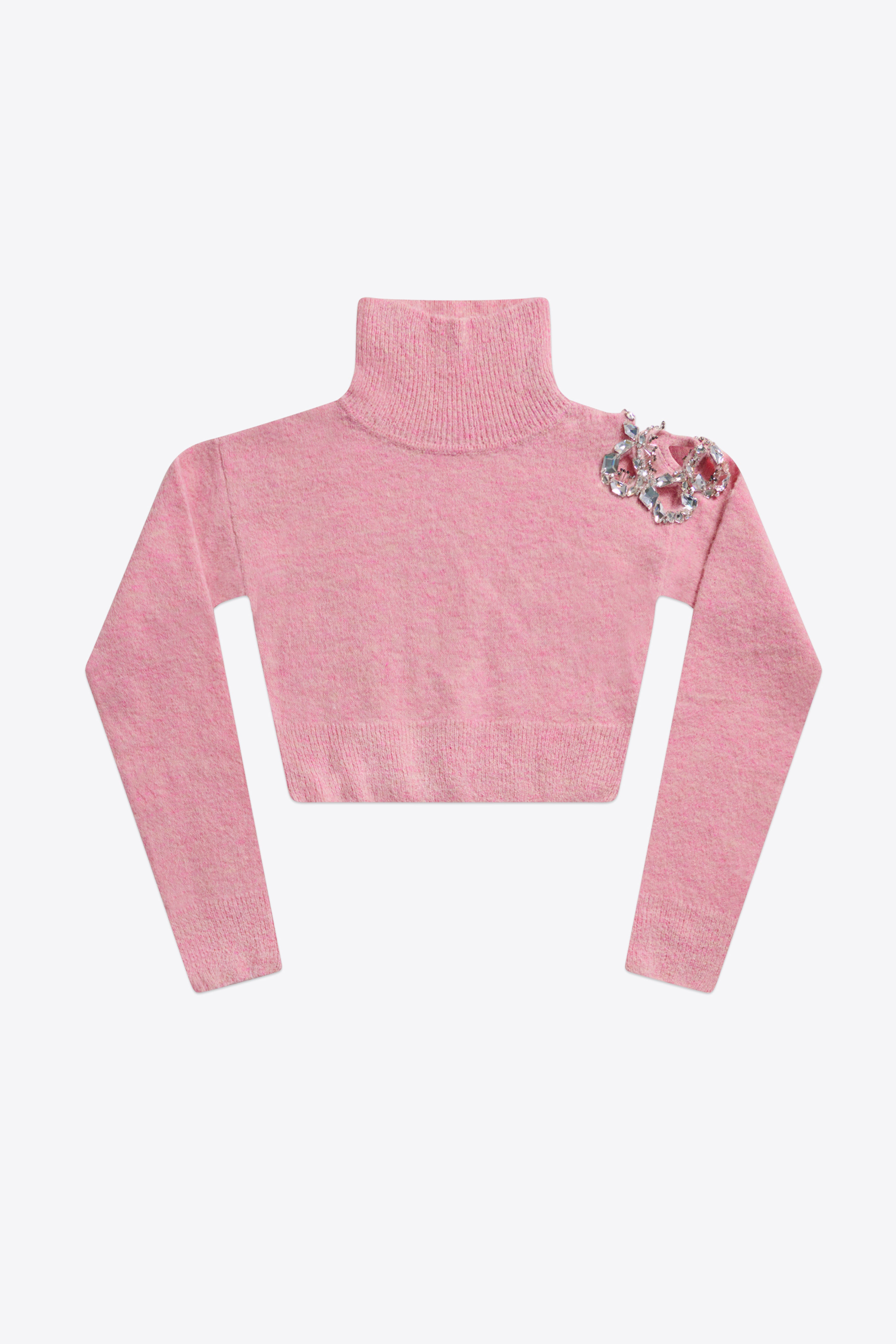 Cropped turtleneck sweater featuring crystal embroidered flower cutout at shoulder. Available in Baby Pink & Black. - 27% Nylon, 25% Alpaca, 25% Wool, 20% Viscose, 3% Spandex - Dry Clean Only - Model is 5'9.5" and wears a size S