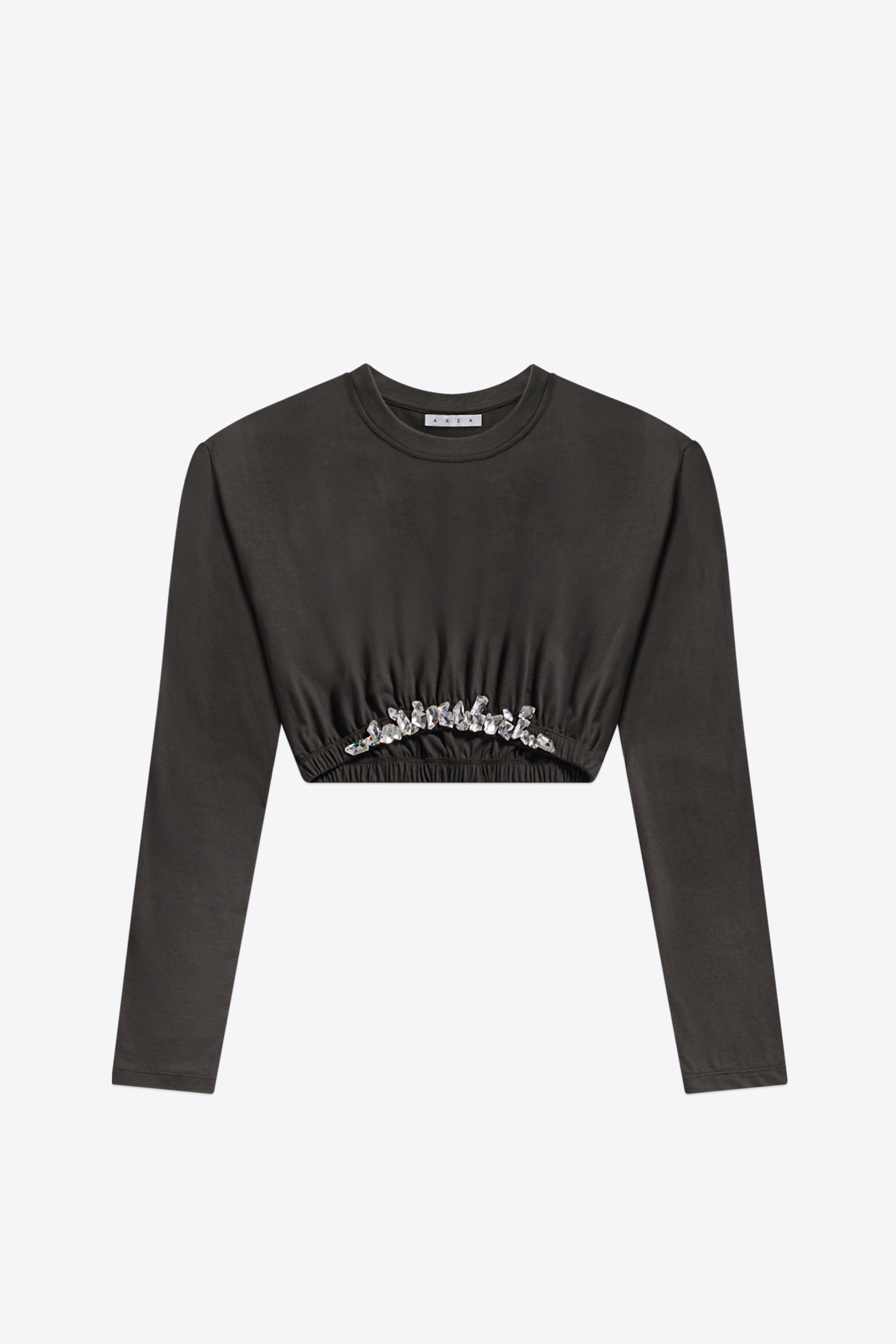 Cotton jersey long sleeve crop top featuring crystal cluster embellished hem. Available in Charcoal & White. - Made in India - 100% Cotton - Dry Clean Only - Model is 5'8" and wears a size S