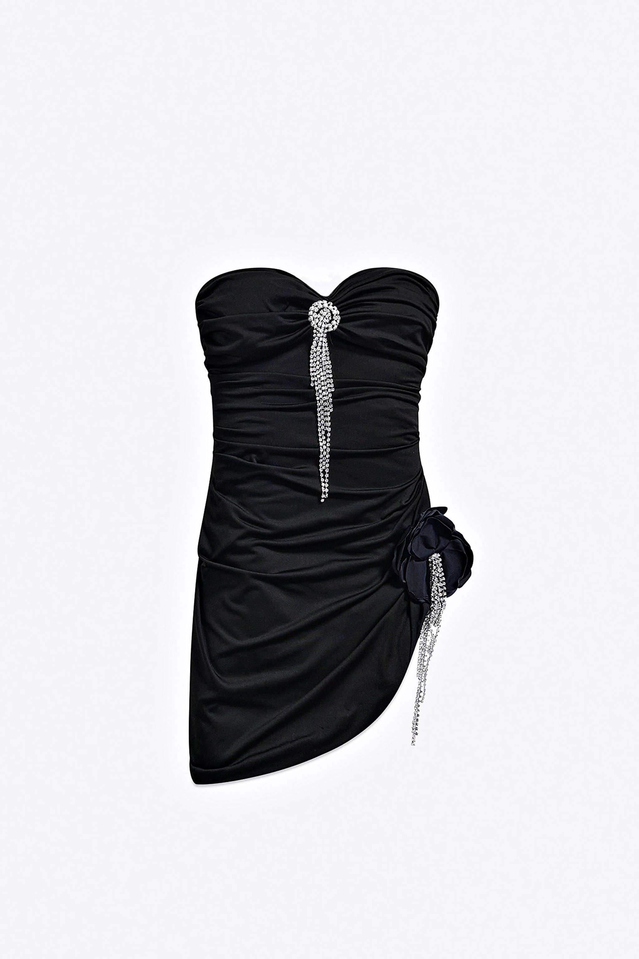 CRYSTAL FLOWER DRAPED STRAPLESS MINI DRESS