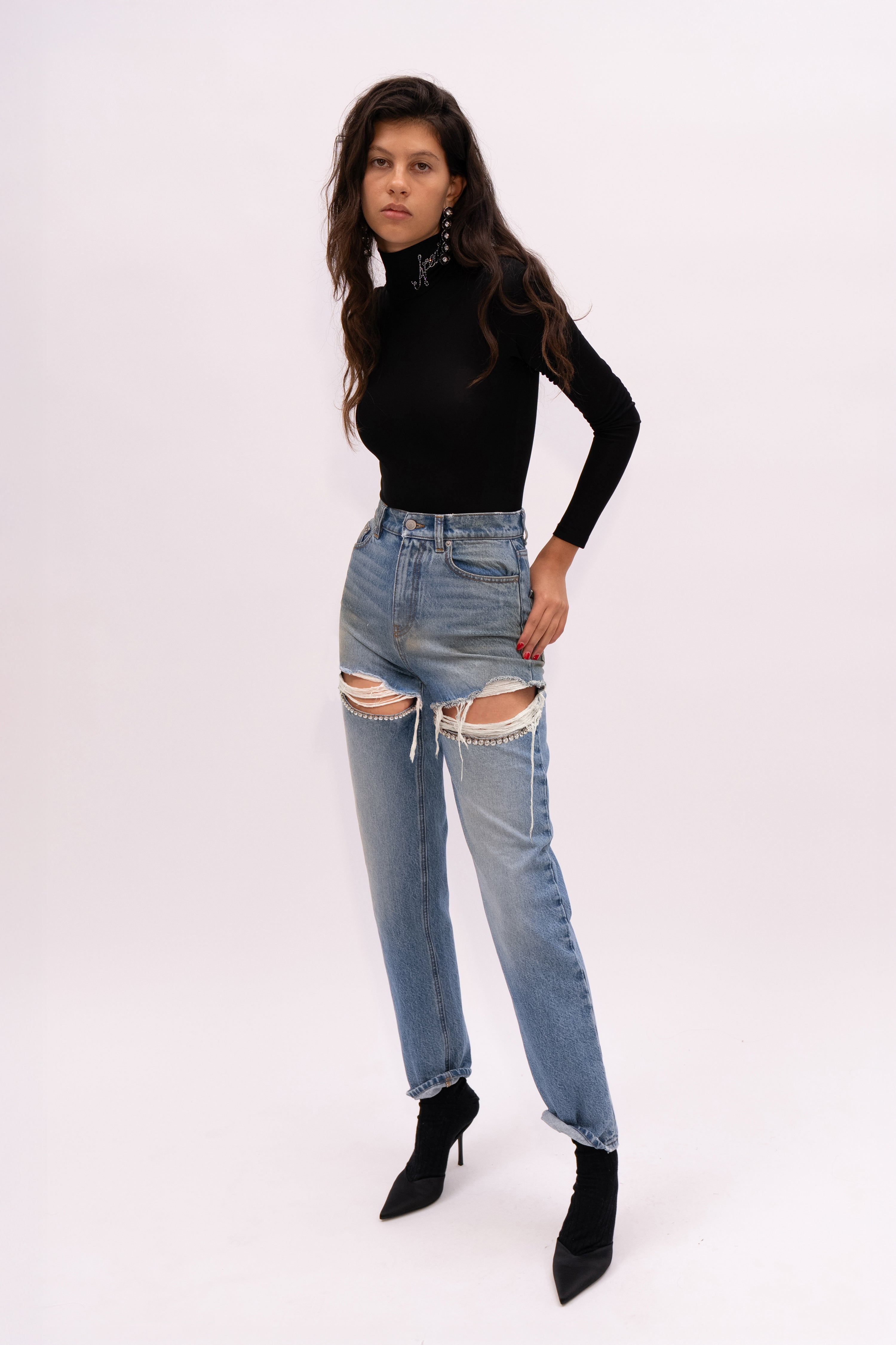 Denim jeans featuring frayed slits at thighs and crystal embellishment. Available in Medium Blue. - Made in Italy - 100% Cotton - Dry Clean Only