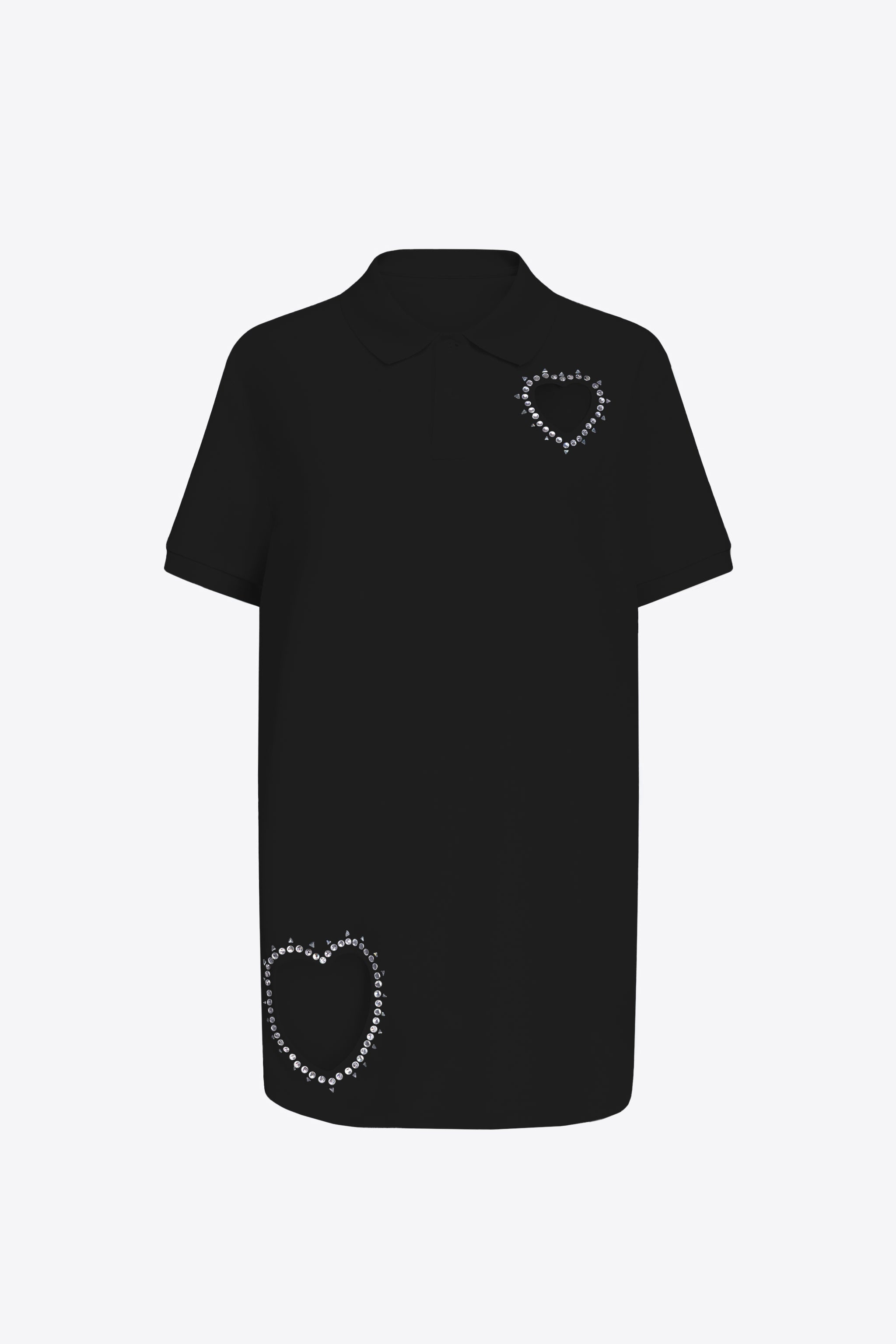 Cotton pique polo dress featuring crystal trim heart cutouts. Available in Black, White & Baby Blue. - Fabric: 100% Cotton, Rib: 100% Polyester - Dry Clean Only - Model is 5'11.5" and wears a size S