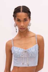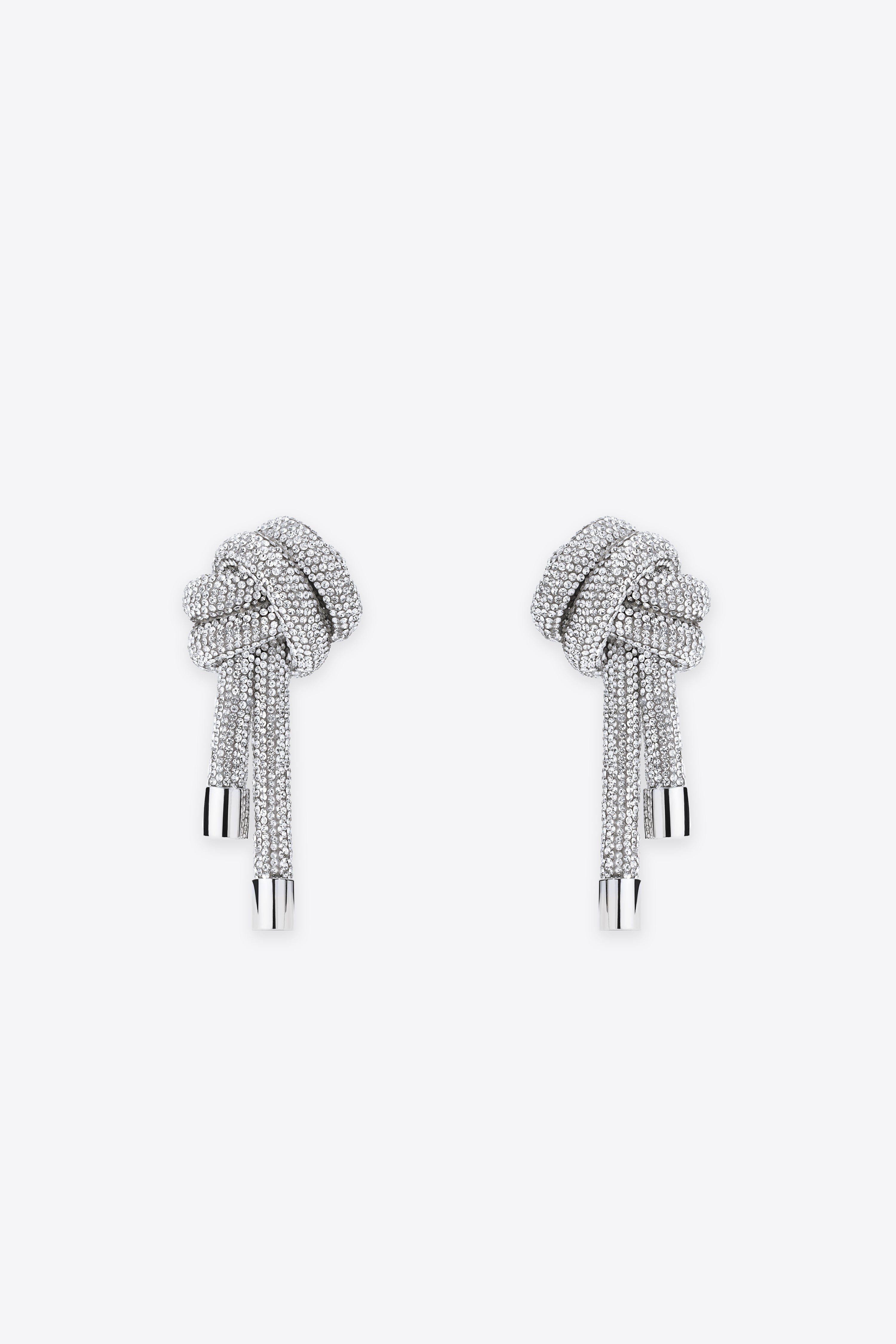 Crystal knot earrings with omega clip and post back closure. Available in Clear Crystal/ Silver. - Metal: 100% Brass, Stone: 100% Glass, Post: 100% Stainless Steel - 91mm x 37.5mm - To protect and assure the longevity of your jewelry and accessories, handle delicately when dressing. Do not wear while swimming, bathing, applying perfumes, lotions or hair products. To clean your pieces use a soft cloth and gently wipe the surface.