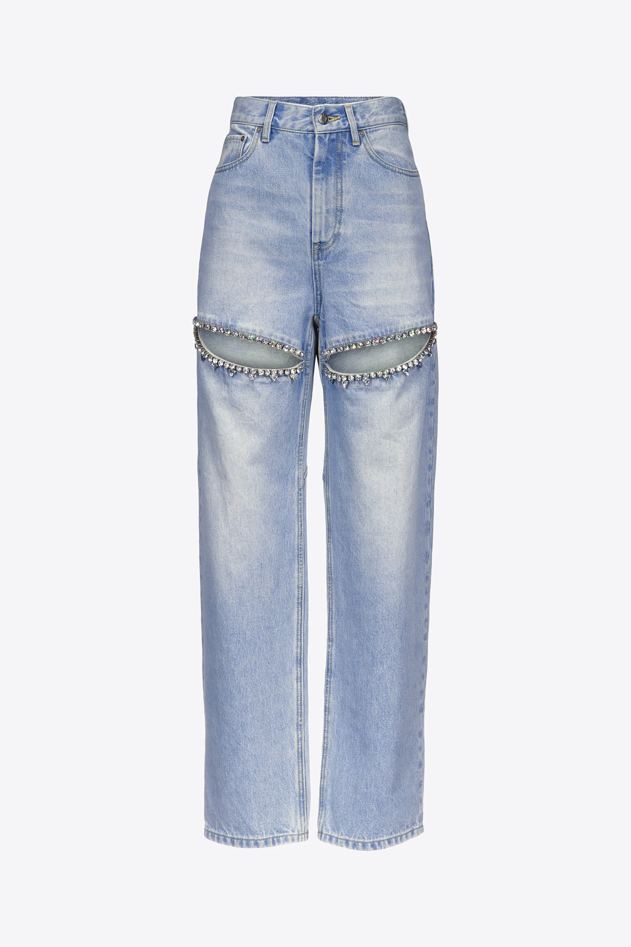 Classic denim jeans feature crystal cupchain trim slits at thighs. Available in Light Blue. - 100% Cotton - Dry Clean Only - Model is 5'11.5" and wears a size US 26