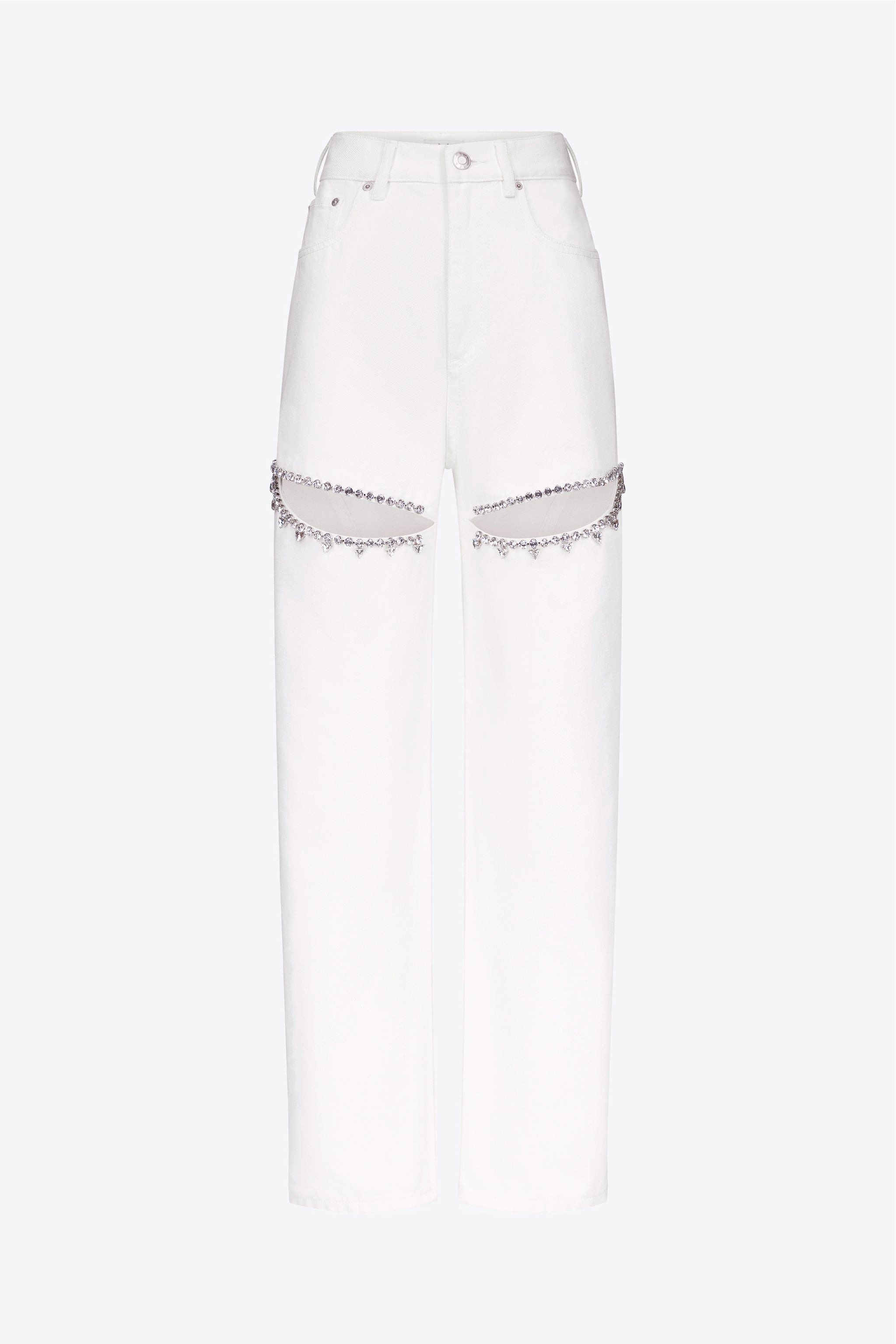 Classic denim jeans feature crystal cupchain trim slits at thighs. Designed with straight leg and mid-rise for a relaxed fit. If in between sizes, we recommend you size down. Available in White, Light Blue, Black & Pink. - 100% Cotton - Dry Clean Only - Runs large. We recommend taking 1 size down.