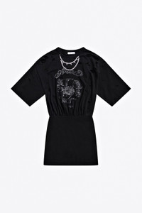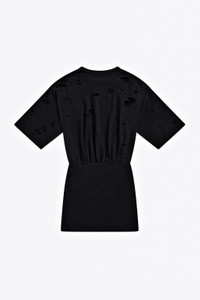 Cotton distressed graphic t-shirt dress featuring crystal spike embellishment at collar. Available in Black. - Made in Italy - 100% Cotton - Dry Clean Only - Model is 5'9.5" and wears a size S