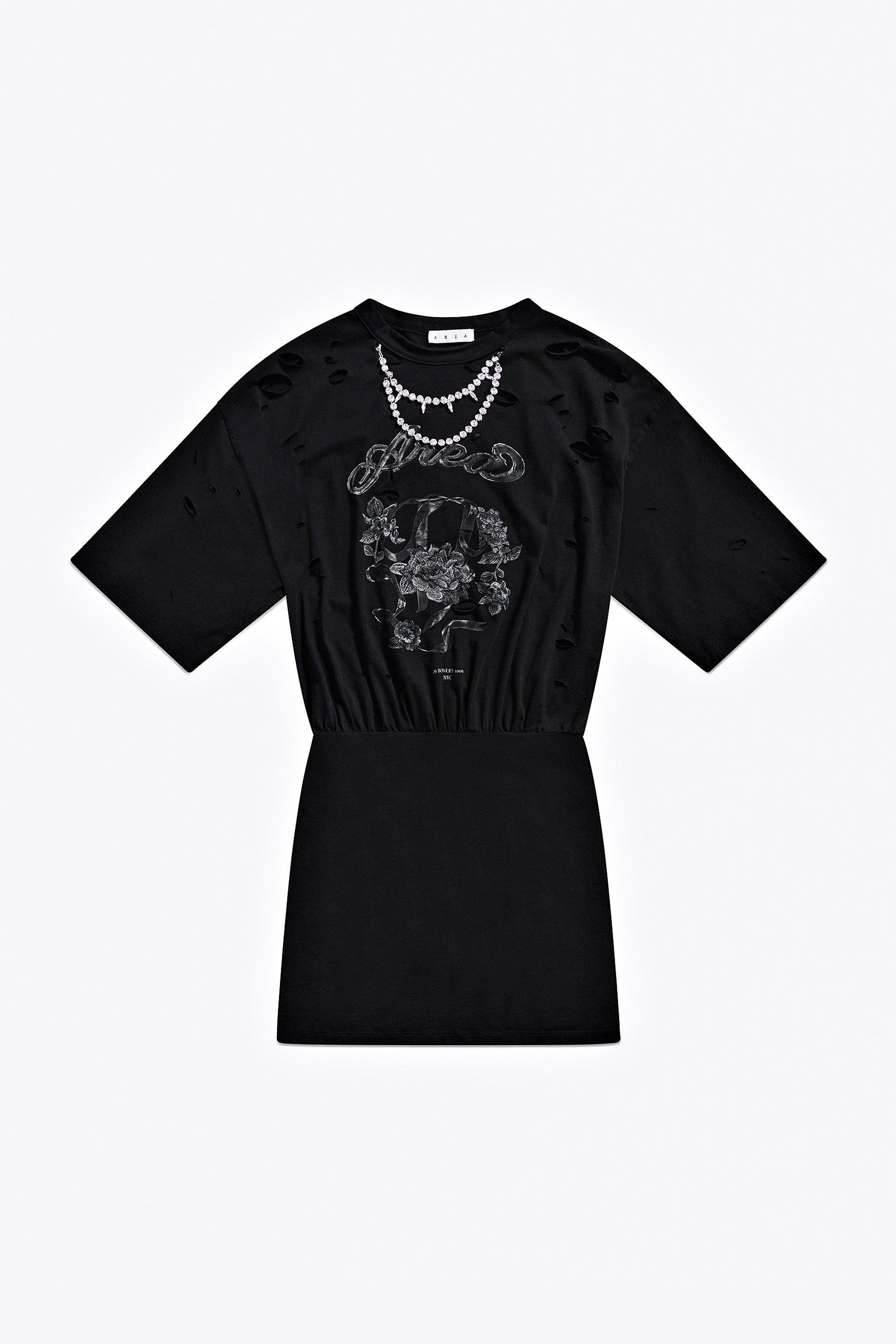 DISTRESSED CRYSTAL EMBELLISHED GRAPHIC T-SHIRT MINI DRESS