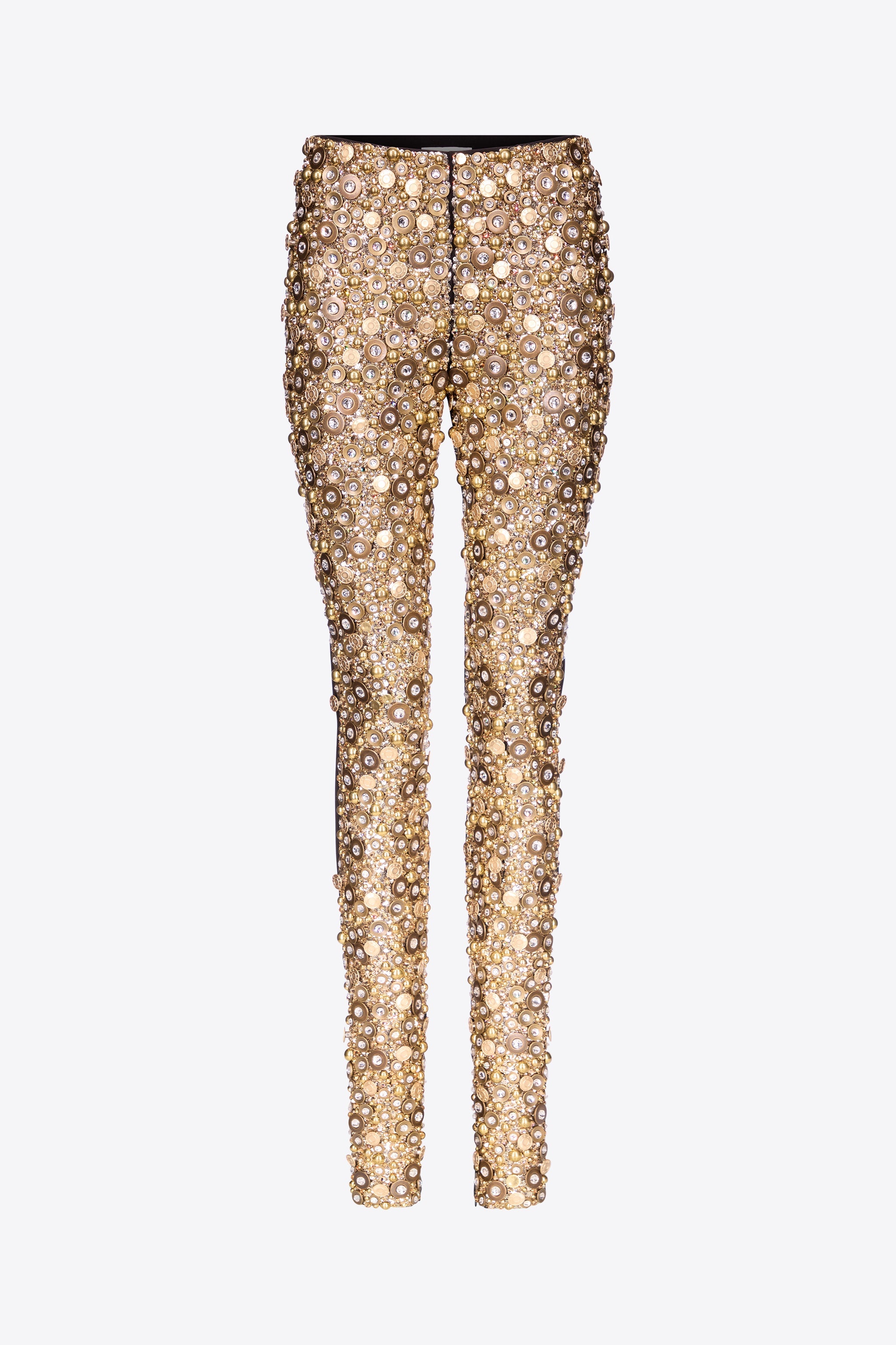 Compact ponte leggings embroidered and hand-finished with crystal buttons, shanks and rivets. Features hidden side zipper and ankle zippers. Available in Black. - Material: 67% Rayon, 28% Nylon, 5% Elastane Stones: 100% Glass Metal: 100% Brass - Dry Clean Only - Model is 5'11" and wears a size US 2