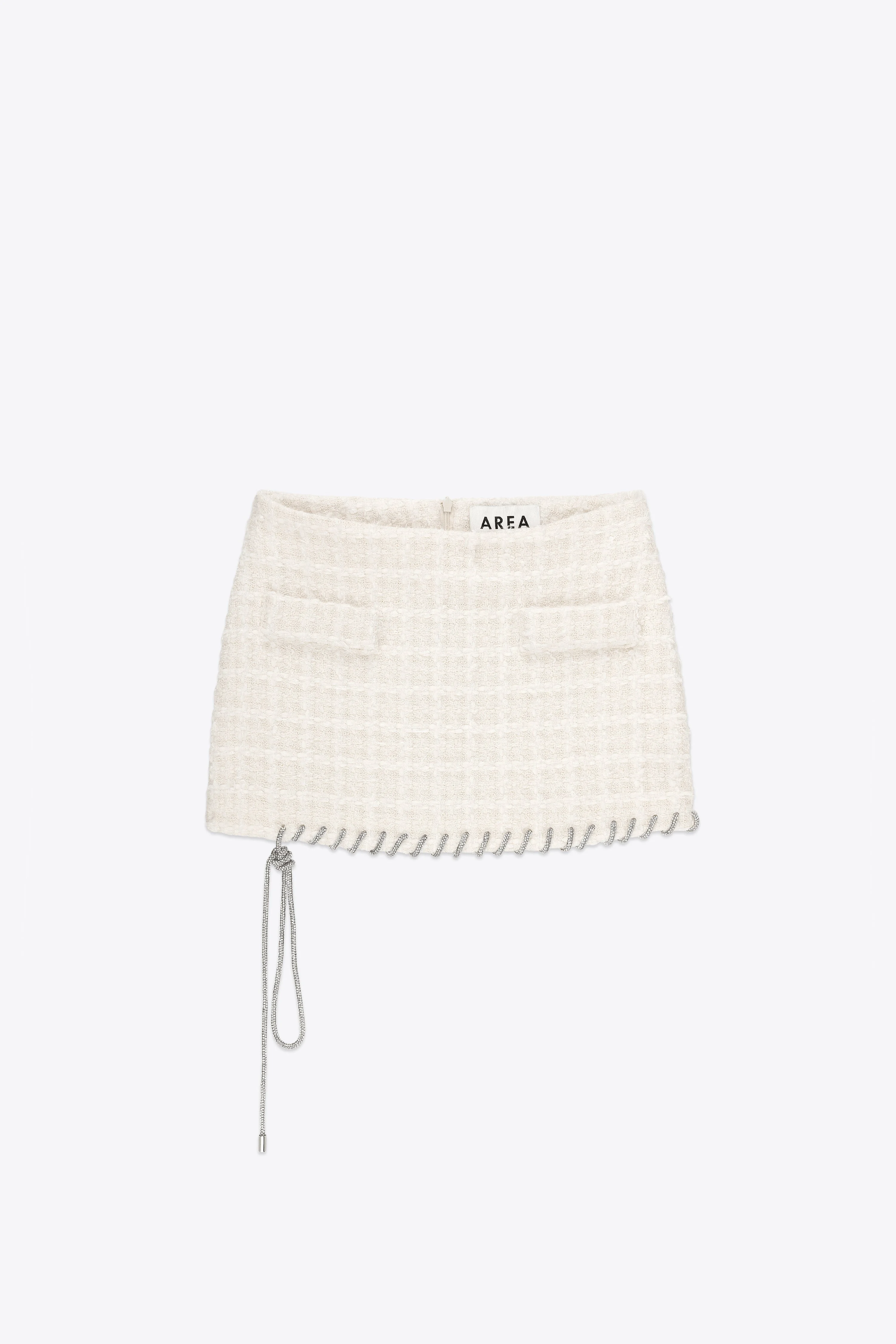 Tweed mini skirt featuring crystal rope knot hem. Available in Cream White. - 30% Virgin Wool, 70% Polyester - Dry Clean Only - Model is 5'11" and wears a size S