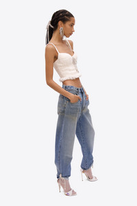 Tweed bustier top with frayed hem and crystal rope bow at center front. Available in Cream White. - 30% Virgin Wool, 70% Polyester - Dry Clean Only - Model is 5'11" and wears a size S