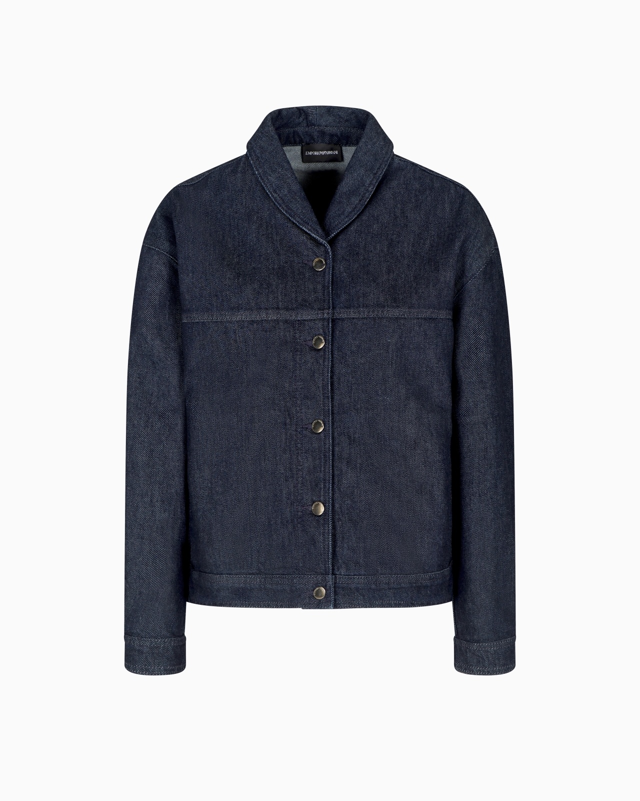 Jacket with shawl collar and front buttons, made of denim. Leather logo jacron on the back. A versatile style with a modern allure, designed to complete multiple looks. Denim Shawl collar Front buttoning Long sleeves Single-buttoned cuffs Leather logo jacron at the back Product Code: EW002458AF18421MB001