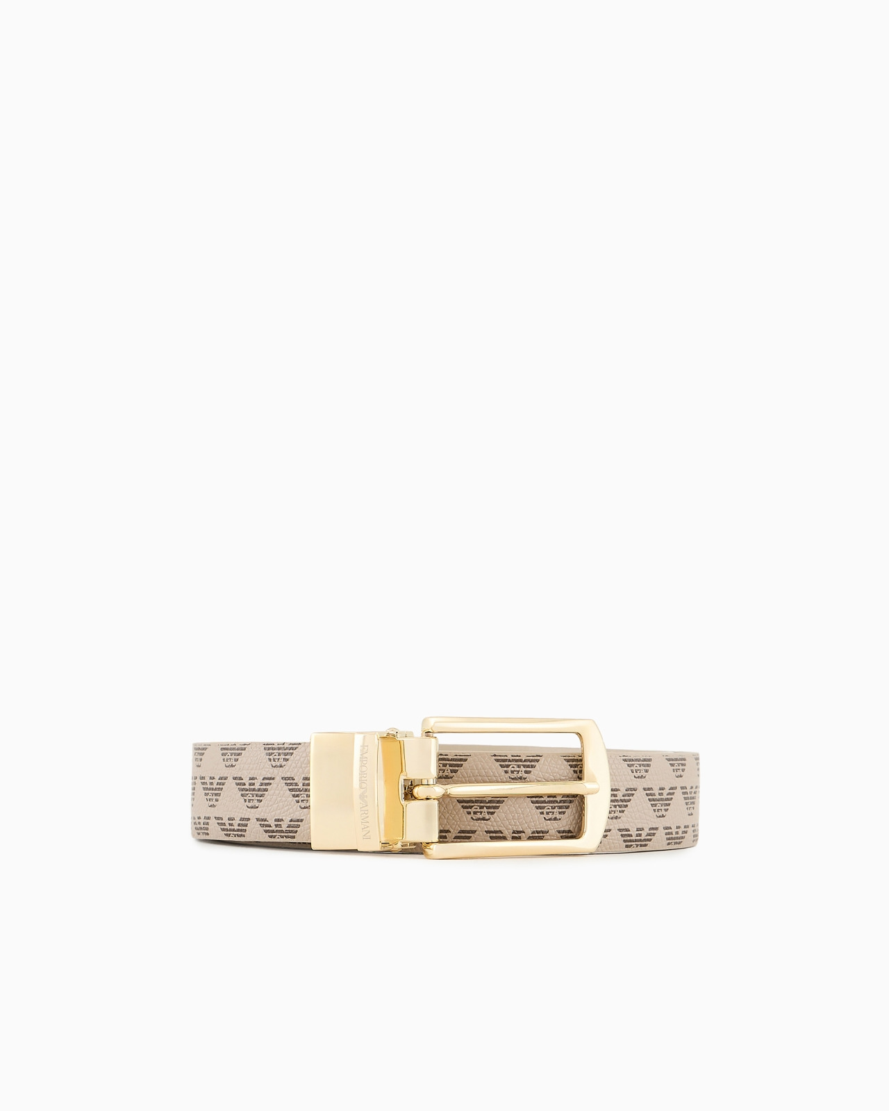 Reversible belt with metal buckle. Featuring an all-over print of the iconic eagle on one side and a contrasting solid-colour nappa finish on the other, it can be reversed to be worn on a wide array of occasions. Product Code: Y3I373YFJ5A180776 Details Composition 100% Polyester Width: 3 cm Reversible All-over eagle print on the outer side Nappa-finish inner side Buckle fastening Made in Italy