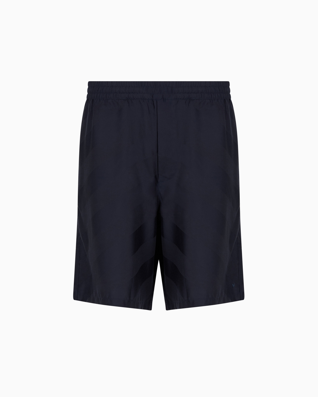 Elasticated-waist Bermuda shorts with an internal drawstring made of fluid, cosy and lightweight Lyocell, a semi-synthetic fibre that has an exceptionally low impact on the environment. It is derived from the eucalyptus tree and is renowned for being moisture-wicking, durable, breathable and wrinkle-proof. The decorative tone-on-tone jacquard pattern runs across the entire garment. Product Code: 6D1PE31NUHZ1F919 Details Composition 100% Lyocell All-over jacquard pattern Elasticated waist Inner drawstring Front concealed zip closure Side inseam pockets Back welt pockets Fitting The model is 188 cm tall and is wearing size 48/M (Italian Size)