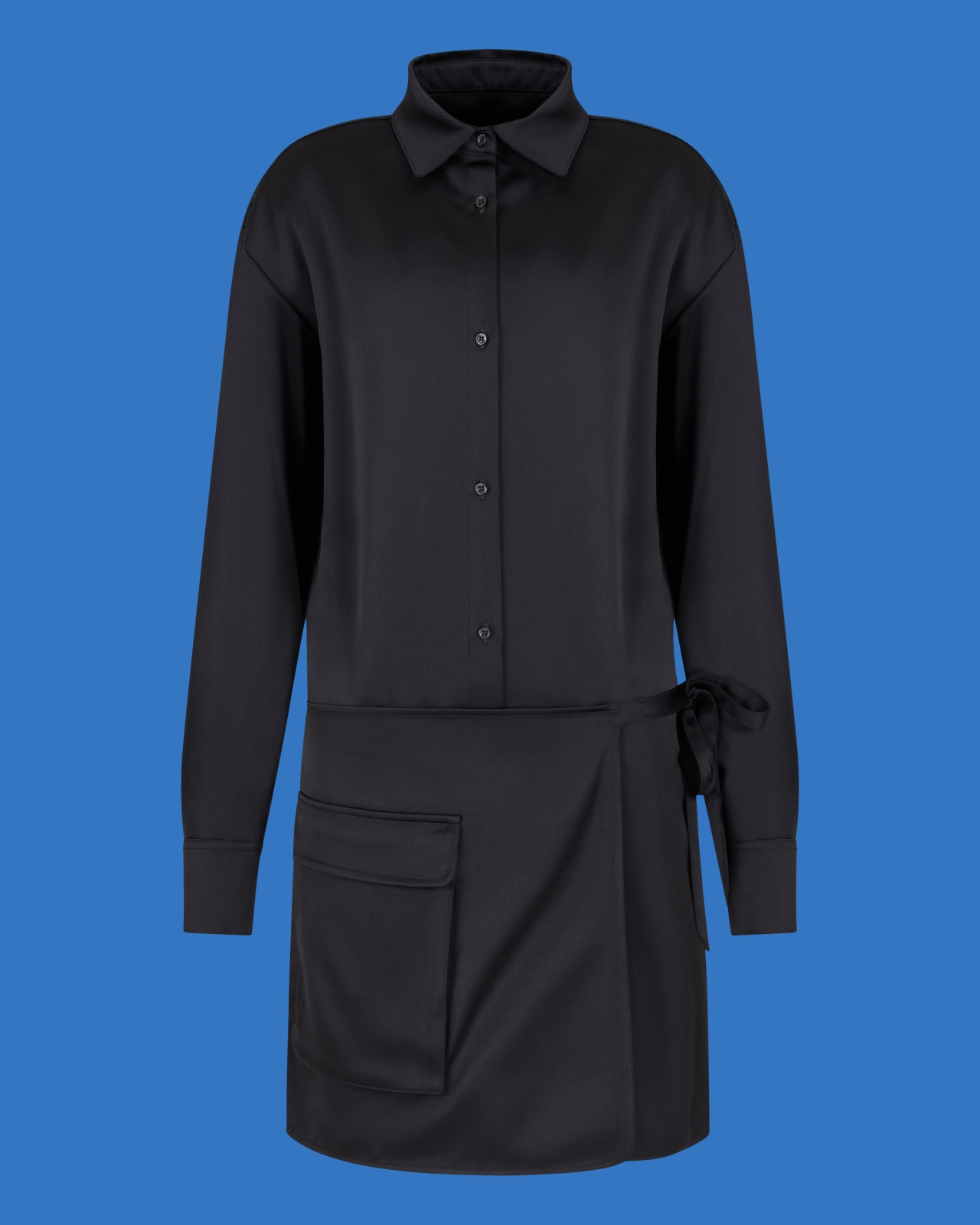 Dress with classic shirt collar and skirt with a sarong-style closure panel, in a viscose-blend satin made from certified recycled material. Emporio Armani maintains its focus on sustainability with the new Armani Sustainability Values (ASV) capsule collection, highlighting the need for a supply chain that is responsible and attentive to the resources of our planet. Named Black Blue, this futuristic collection takes us to a colour dimension that evokes distant, uncharted planets. The alternation of two key colours, blue and black, explodes in the Cosmos print, giving the entire collection a modern feel. The clothing is defined by atypical contrasting shapes: sometimes oversized for exceptional comfort and freedom of movement, and sometimes super skinny to enhance the silhouette with ultra-elongated lines. Hints of feminine colour harmoniously complete the blue-black pairing. Product Code: 6D2AA12NB6Z10999 Details Composition 49% Polyester 47% Viscose 4% Elastane The fabric is made of 49% recycled polyester Satin Classic collar Front buttoning Long sleeves Single-buttoned cuffs Wrap skirt with ties Back yoke