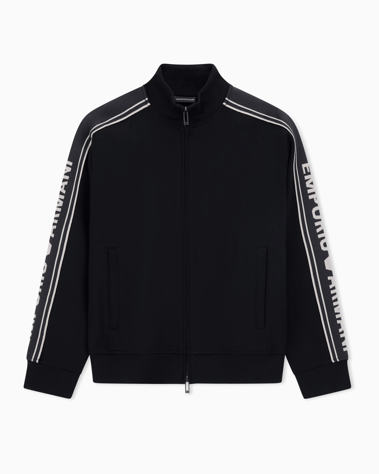 Cosy double-jersey full-zip sweatshirt. The side stripes on the sleeves showcase the bold oversized jacquard Emporio Armani logo. A piece with an urban allure that is comfortable and lends itself to casual outfits and daywear. Double jersey Full-zip closure Logo stripes on the sleeve Side pockets Product Code: EM002913AF10013UC001