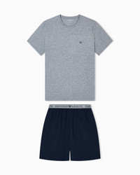 Cotton-jersey pyjamas made of natural fibres from organic farming composed of a crew-neck T-shirt and Bermuda shorts with an elasticated logo waistband. Eagle logo on chest. Fabric: 95% organically grown cotton Stretch jersey 2-piece pyjamas Crew-neck T-shirt Front micro eagle Elasticated-waist Bermuda shorts Product Code: EM000400AF10776M8098