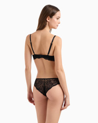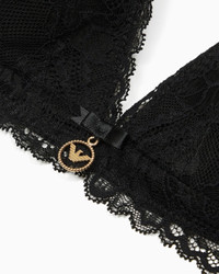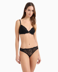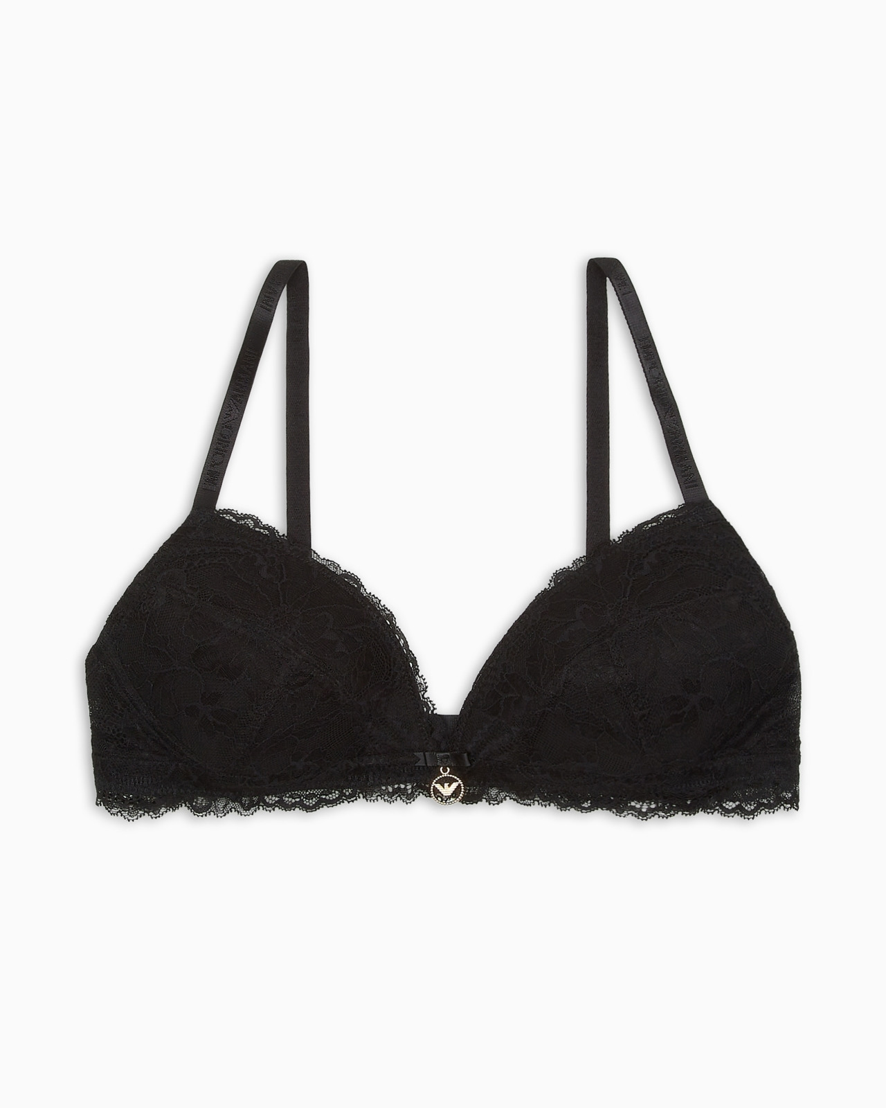 Padded triangle bra with adjustable shoulder straps. Lace fabric made from certified recycled nylon, supporting circular, environmentally friendly production. Matching bow and logo medallion. Product Code: 1646034R206100020 Details Composition 87% Polyamide 13% Elastane The fabric is made of 56% recycled polyamide Lace Padded triangle Logo medallion Adjustable shoulder straps Closure hooks Fitting The model is 178 cm tall and is wearing size 40/S (Italian Size)