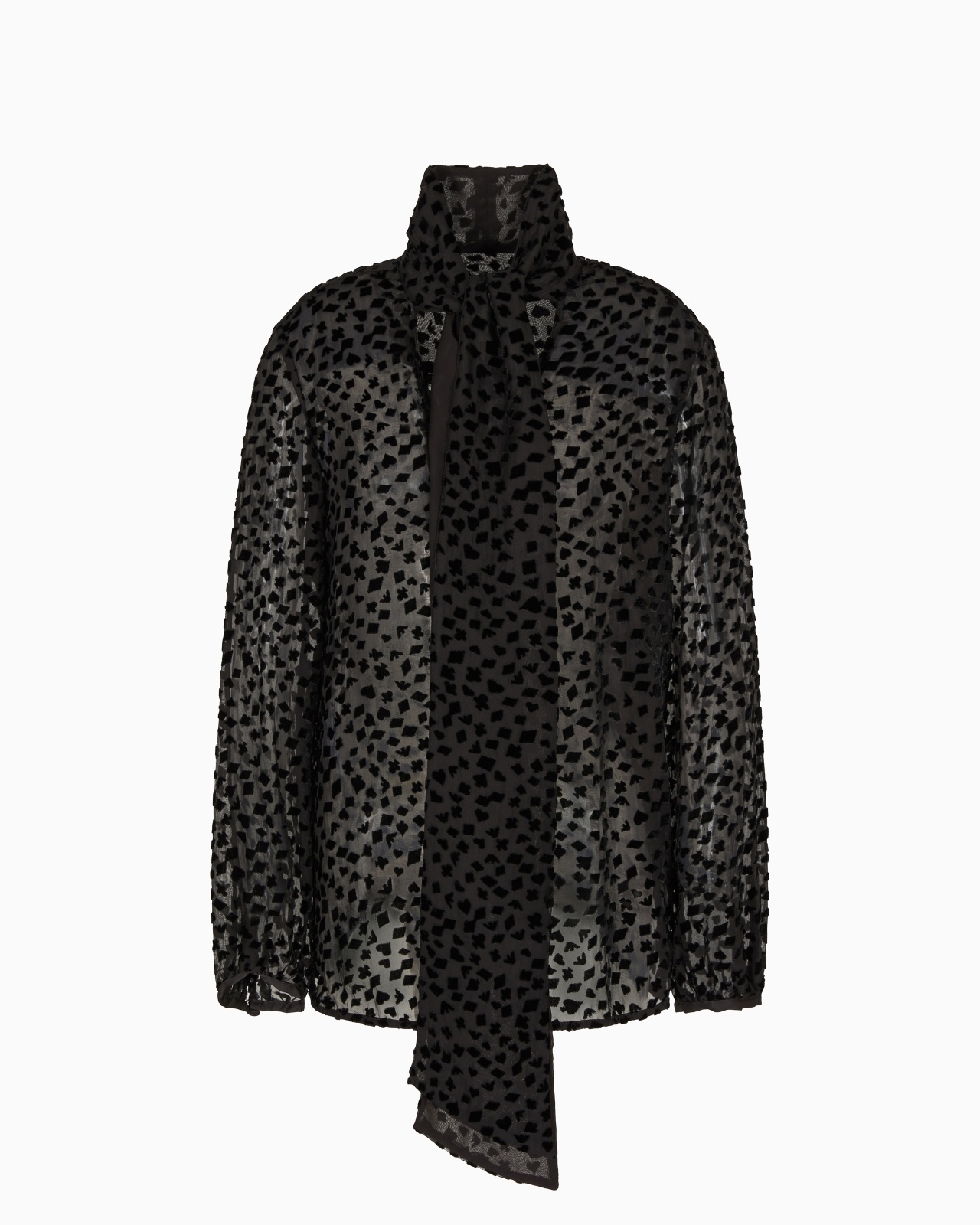 Shirt with tie flaps that create a signature foulard collar. This piece is made of tulle with a devore velvet collection pattern. The intriguing world of playing cards is the theme running through this season’s women’s collection. The Jeu de Cartes theme is playfully interpreted in different details of the collection: the elegance and refinement of Emporio Armani intertwine with the classic symbols of the playing-card suits, to create looks with a mysterious and sophisticated allure. Main fabric: 59% viscose from responsible forestry Tulle Velvet Devore effect Foulard collar Front buttoning Single-buttoned cuffs Petal opening at the back Unlined garment Product Code: EW001347AF14315UC001