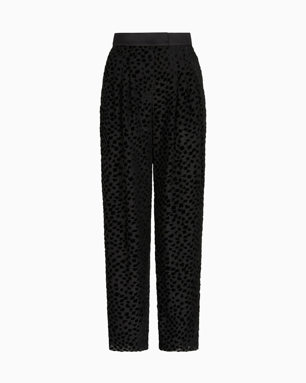 Trousers with pleats at the waist, made from tulle with the collection’s pattern in devore velvet. The intriguing world of playing cards is the theme running through this season’s women’s collection. The Jeu de Cartes theme is playfully interpreted in different details of the collection: the elegance and refinement of Emporio Armani intertwine with the classic symbols of the playing-card suits, to create looks with a mysterious and sophisticated allure. Main fabric: 59% viscose from responsible forestry Tulle Velvet Devore effect Waist with pleats Closure with zip, hook and back button Side pockets Georgette lining Product Code: EW001476AF14315UC001