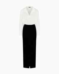 Long dress in a sophisticated two-piece effect, with a top that recalls the construction of a shirt and a contrasting long skirt. The georgette top is embellished with an embossed ornamental motif inspired by the collection theme. The skirt, with a wrap closure, is crafted from a dense, lustrous cupro-blend viscose. The intriguing world of playing cards is the theme running through this season’s women’s collection. The Jeu de Cartes theme is playfully interpreted in different details of the collection: the elegance and refinement of Emporio Armani intertwine with the classic symbols of the playing-card suits, to create looks with a mysterious and sophisticated allure. Main fabric: 65% viscose from responsible forestry, 35% cupro from cotton by-product recycling Length: 150 cm Two-piece effect Classic collar Long sleeves Cuffs with collection button Embossed ornamental motif Skirt with wrap closure Side button-and-zip closure Product Code: EW001344AF10208UC001
