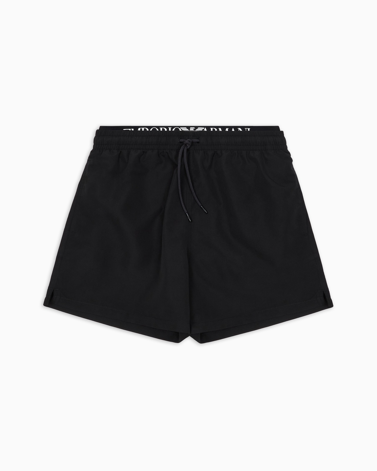 Swim shorts with drawstring and elasticated insert at the waist with jacquard front logo. The fabric is made of certified recycled polyester, supporting circular production with a reduced environmental impact. Elasticated insert with logo Drawstring waist Side pockets Product Code: EM000686AF12329MC117