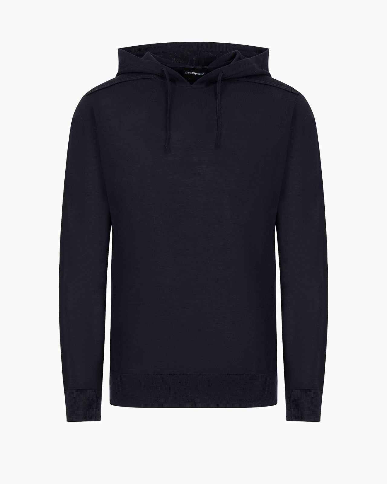 Virgin-wool and Lyocell-blend jumper in a light, plain knit, completed by a practical drawstring hood. The style is made from a Lyocell blend, a semi-synthetic fibre that has an exceptionally low impact on the environment. It is derived from eucalyptus trees and is renowned for being very durable, breathable, absorbent and wrinkle-proof. This item belongs to the Essentials clothing selection, the Emporio Armani capsule collection that is an evergreen statement of style: an ongoing collection with clean, well-designed shapes for a wardrobe that meets the demands of any season. These “essential”, versatile pieces are a must-have for the male wardrobe. Product Code: 8N1MUW1MJWZ10920 Details Composition 60% Virgin Wool 40% Lyocell Fineness: 14 Plain knit Drawstring hood Long sleeves Rib-knit cuffs and hem Fitting The model is 188 cm tall and is wearing size 48/M (Italian Size)