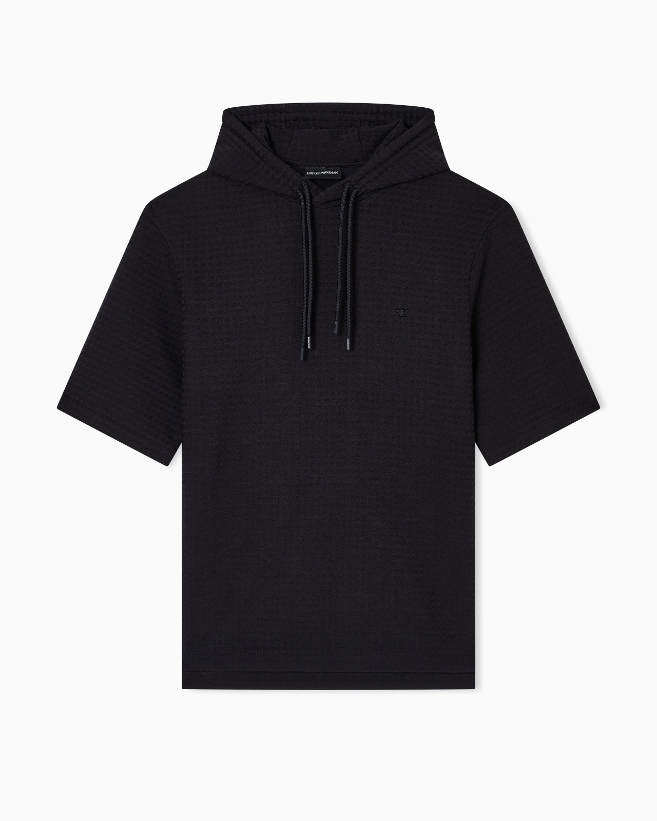 Short-sleeved sweatshirt with drawstring hood. Made from Lyocell-blend jersey. Lyocell is a semi-synthetic fibre that has an exceptionally low impact on the environment. It is derived from eucalyptus trees and is renowned for being very durable, breathable, absorbent and wrinkle-proof. The jacquard pattern creates an original all-over motif, adding prestige and personality to the style. This refined style can be worn anywhere and with anything. Jersey Jacquard Drawstring hood Short sleeves Micro-eagle embroidery on the chest Product Code: EM003143AF13700FC231