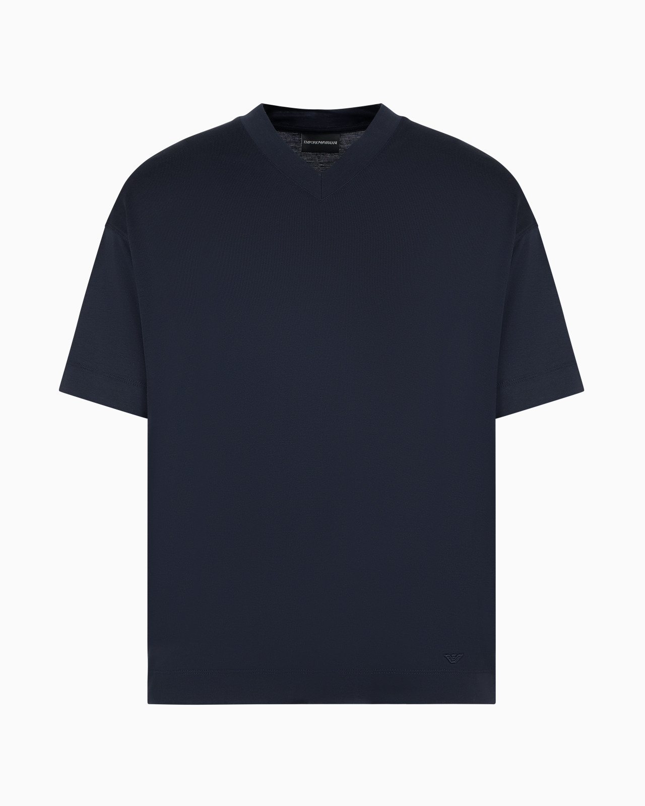 V-neck T-shirt made from a cotton and Lyocell-blend jersey, a semi-synthetic fibre that has an exceptionally low impact on the environment. It is derived from eucalyptus trees and is renowned for being very durable, breathable, moisture-wicking, and wrinkle-proof. Product Code: 6D1TC81JOSZ10920 Details Composition 70% Lyocell 30% Cotton Jersey V neck Short sleeves Embossed micro eagle on the left hem Fitting The model is 188 cm tall and is wearing size 48/M (Italian Size)
