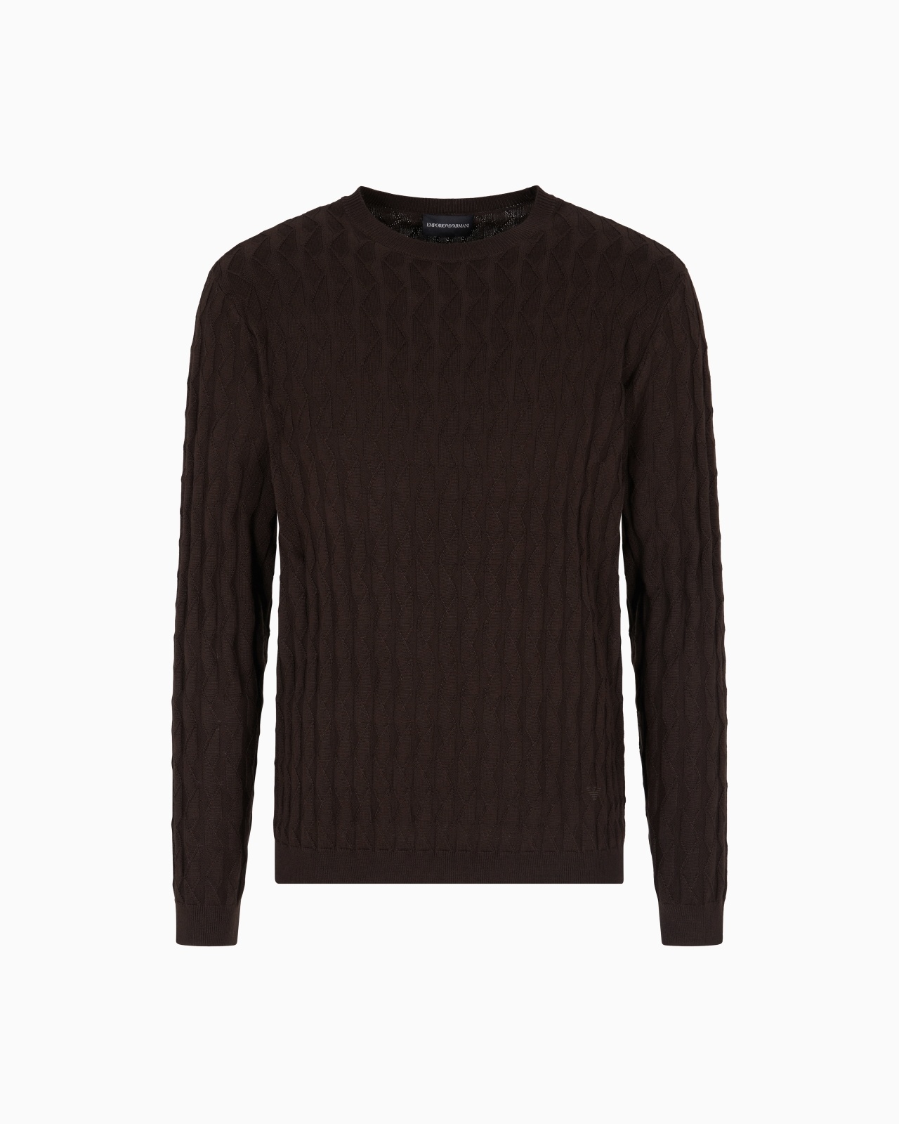 Crew-neck jumper made of Lyocell blend, a semi-synthetic fibre that has an exceptionally low impact on the environment: it is produced from eucalyptus leaves and is valued for its good resistance, capacity to absorb moisture, excellent breathability and being wrinkle-resistant. The particularly lightweight patterned knit showcases an exclusive embossed motif. Fineness: 12 and 14 Patterned knit Crew neck Long sleeves Rib-knit cuffs and hem Micro eagle embroidered on the left hem Product Code: EM003507AF14854U6032