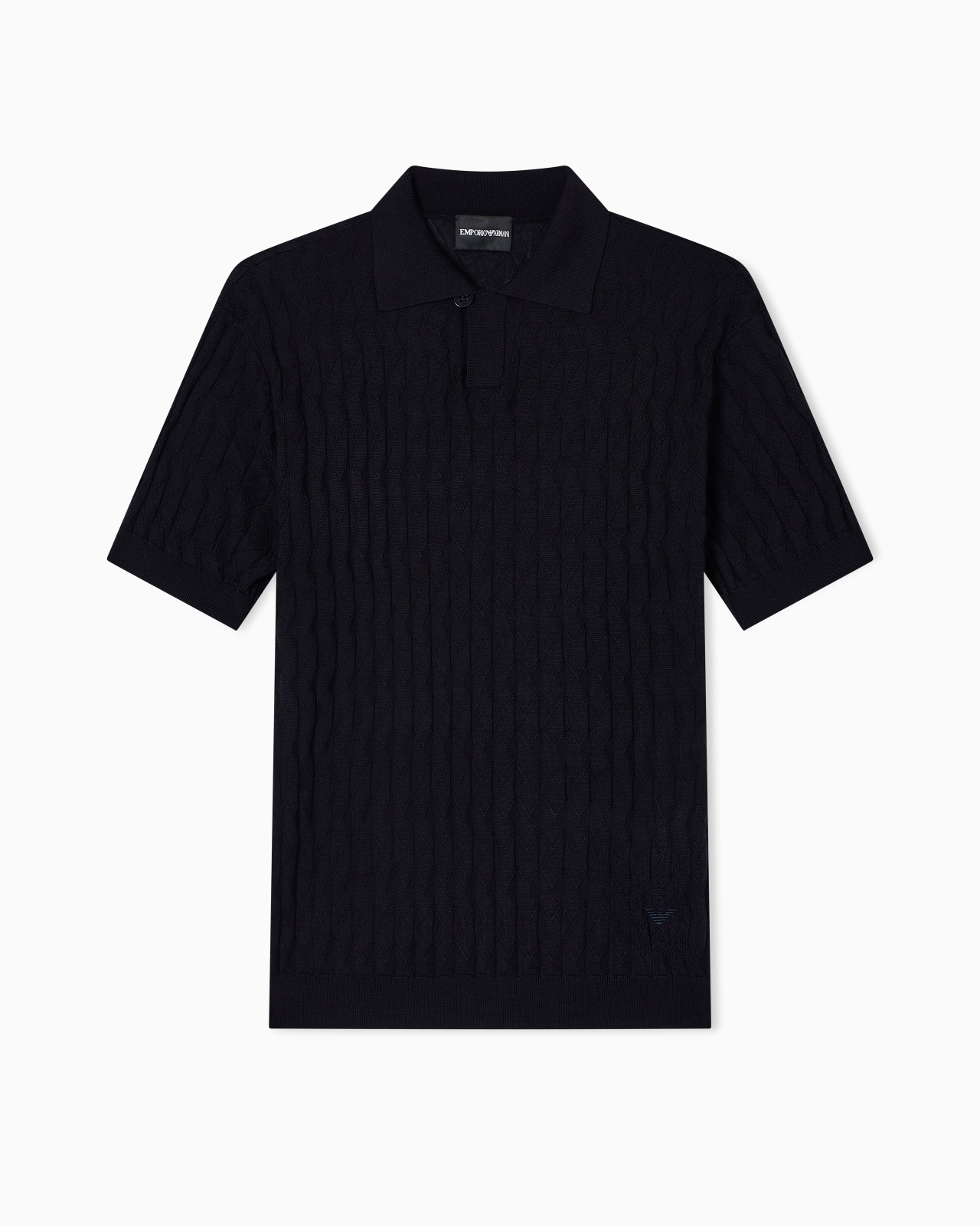 Jumper with polo-shirt collar, made from a Lyocell blend. Lyocell is a semi-synthetic fibre that has an exceptionally low impact on the environment. It is derived from eucalyptus trees and is renowned for being very durable, breathable, absorbent and wrinkle-proof. The particularly lightweight patterned knit showcases an exclusive embossed motif. Fineness: 12 and 14 Patterned knit Polo-shirt collar Short sleeves Rib-knit cuffs and hem Micro eagle embroidered on the left hem Product Code: EM003508AF14854UB109