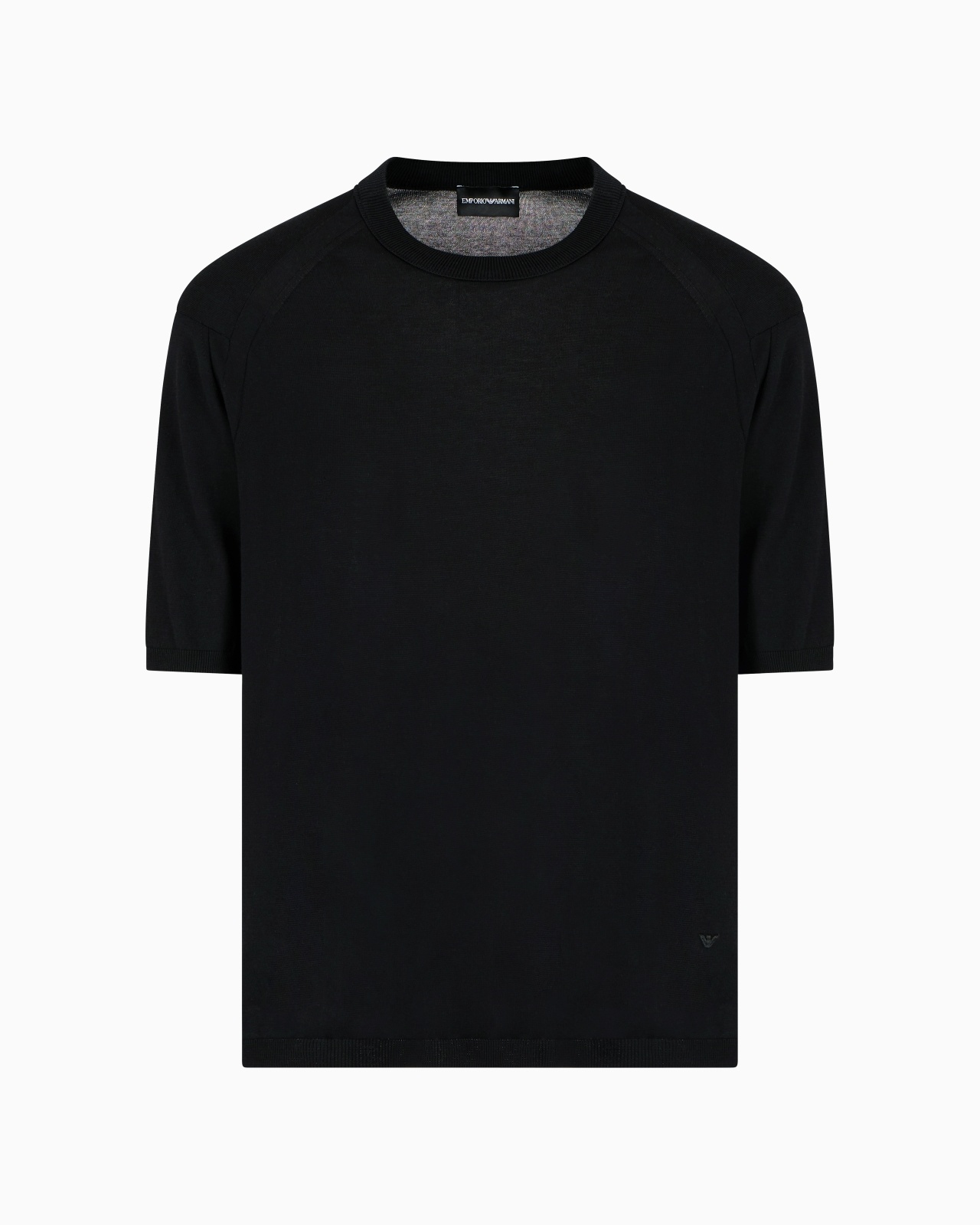 Crew-neck, short-sleeved jumper made of a blend of cotton, silk and Lyocell in a special lightweight and soft-textured knit. Lyocell is a semi-synthetic fibre known for its extremely low impact on the environment. Produced from eucalyptus trees, it is valued for being moisture-wicking, durable and breathable. Fineness: 16 Plain knit Crew neck Short sleeves Micro-eagle embroidered at the left hem Rib-knit cuffs and hem Product Code: EM000672AF13907UC001