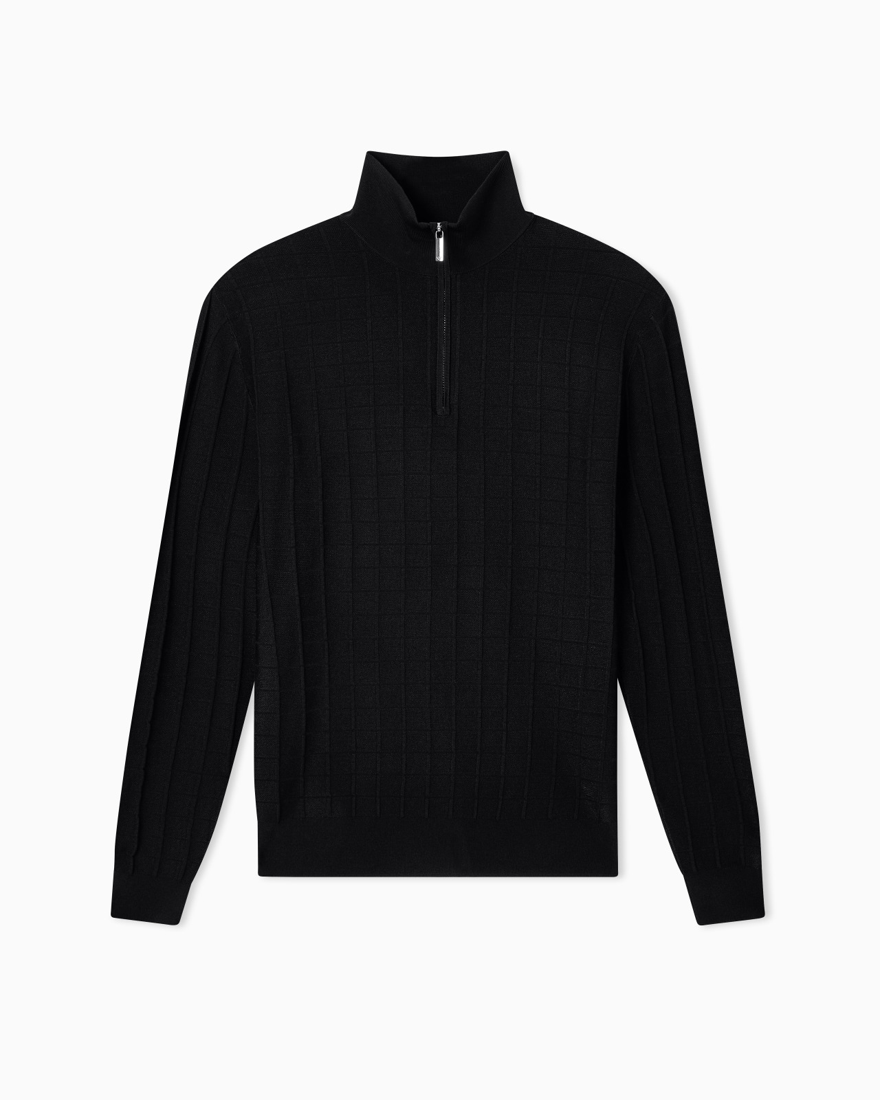 Jumper with a mock neck and practical partial zip. Made of a cosy viscose knit fabric that creates a slightly embossed 3D-effect check motif. Fabric: 85% viscose from responsible forestry Fineness: 16 Knit Checked Mock neck Partial zip Rib-knit cuffs and hem Micro eagle embroidery on the left hem Product Code: EM003501AF14853UC001