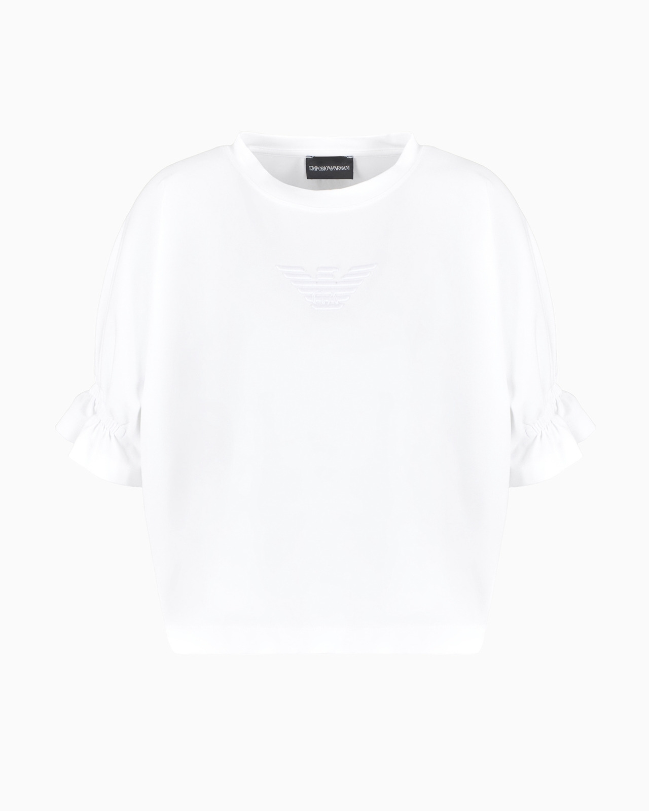 T-shirt with a ruffle on the short sleeves and a front print, in organic-cotton stretch jersey, a fabric made with natural fibres from organic farming. The iconic eagle logo, which has always been the hallmark of Emporio Armani, is still undoubtedly the essence of every piece, managing to elevate every garment with its simplicity. Here it is monochromatic and embroidered and takes centre stage. Product Code: 6D2M7K2JMMZ10101 Details Composition 91% Cotton 9% Elastane The fabric is made of 91% organic cotton Stretch jersey Crew neck Short sleeves with ruffle Matching eagle embroidery Fitting The model is 178 cm tall and is wearing size 40/S (Italian Size)