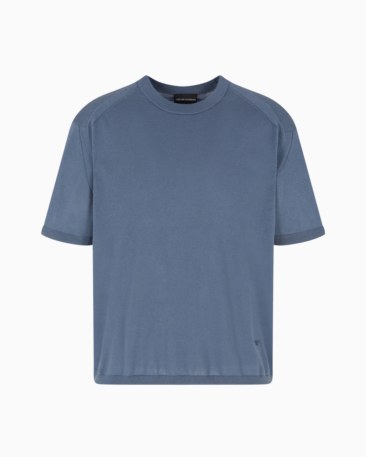 Crew-neck jumper made in a plain knit. The style is made from a Lyocell blend, a semi-synthetic fibre that has an exceptionally low impact on the environment. It is derived from eucalyptus trees and is renowned for being very durable, breathable, absorbent and wrinkle-proof. Fineness: 14 Plain knit Crew neck Short sleeves Rib-knit cuffs and hem Micro eagle embroidered on the left hem Product Code: EM003384AF18995U9302