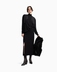 Skirt made of viscose crepe interlock, whose natural flow and lightness give the piece a bold, ultra-feminine look that will add a touch of luxury to any outfit. The style with an invisible zip fastening and decorative button has a slit on the right side. The style is part of this season’s new Polygon capsule collection, where vertical lines and geometric cut-outs capture the essence of a modern, elegant design. An offering that exudes post-modernist vibes, creating a perfect balance between functionality and aesthetic harmony: structured and refined creations are developed in melange grey tones that go hand in hand with the warmest undertones of burgundy. Fabric: 96% viscose from responsible forestry Length: 86 cm Viscose crepe Concealed zip fastening Decorative button at the waist Right side slit Unlined garment Product Code: EW002699AF19052UC001