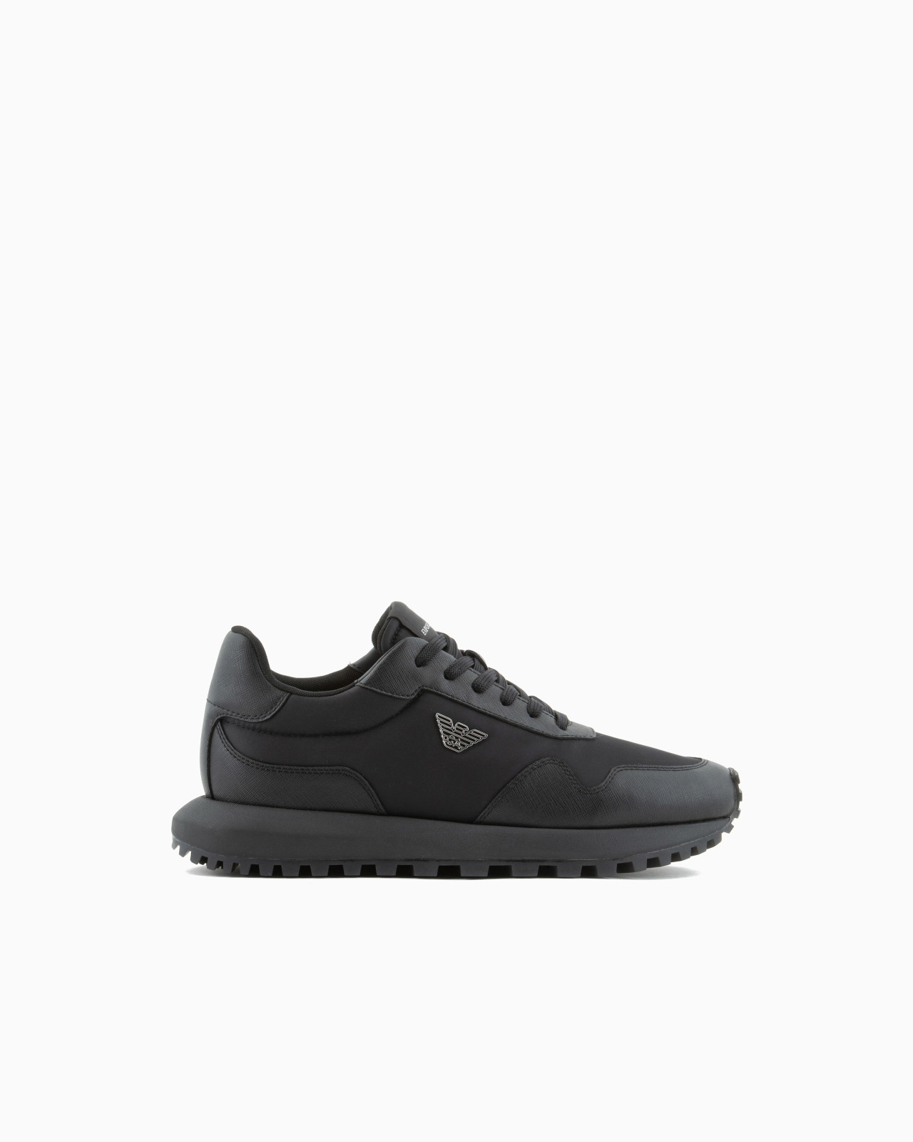 Sneakers made from recycled nylon with regenerated leather details and exclusive Saffiano embossing. The moulded metal plaque on the iconic eagle fixed on the side distinguishes the style. The customised running shoe sole is made of recycled EVA with non-slip tread. Thanks to an expert mix of materials, these multi-textured sneakers have a bold, modern personality. Inspired entirely by heritage running, this item adds laid-back allure to classic looks. Product Code: X4X630XN8771K001 Details Composition 100% Polyamide Recycled nylon Regenerated leather details Eagle plate Lace-ups Rounded toe Rubber soles