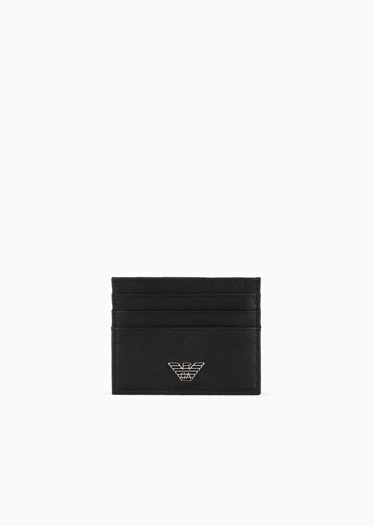 Classic card holder in regenerated leather made from certified recycled materials: the ideal accessory to hold all the cards and documents you need. Every product made from regenerated leather is the result of an eco-sustainable process that re-purposes left-over leather, processed and assembled without using any adhesive whatsoever and very conscious of water conservation. Not wasting resources helps to make this leather an environmentally-friendly material, yet it retains the same qualities of real leather, both to the eye and to the touch. A collection of accessories created to satisfy the requirements of the Emporio Armani man who demands stylish, work-ready looks. The essential, alluring design features a Saffiano-print finish and is customised with a shaped, perforated metal eagle logo. Product Code: Y4R173Y138E181072 Details Composition 53% Polyamide 47% Polyester The material is made of 100% regenerated leather fibres Measurements: 10.2 x 8.1 x 0.5 cm Regenerated leather Saffiano leather Eagle plate Card holder slots