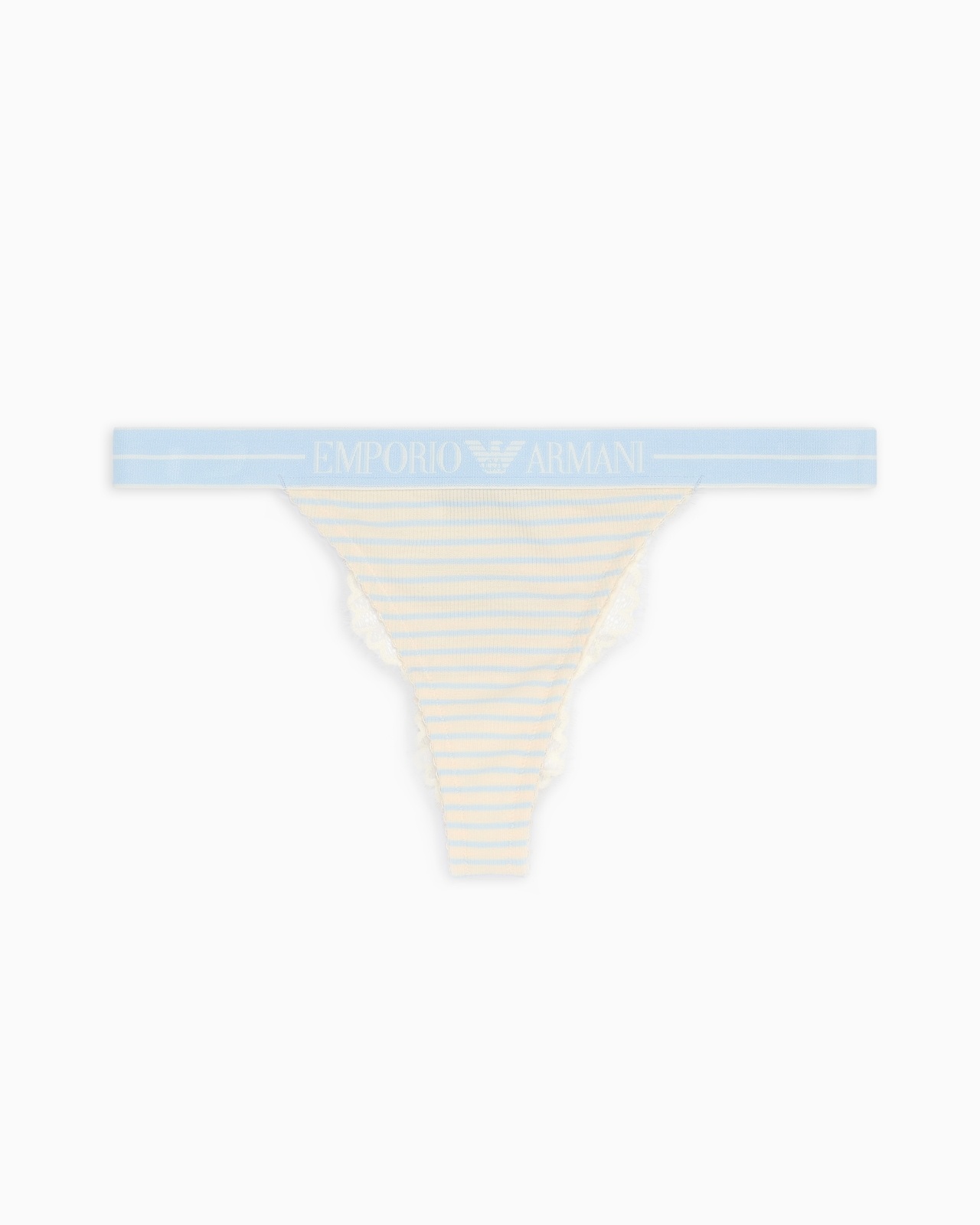 Thong with logo elastic waistband and lace details. Ribbed, striped jersey fabric made from certified recycled polyester, supporting circular, environmentally friendly production. Rib-knit Lace details Elasticated waist with logo Product Code: EW000397AF10885F1030