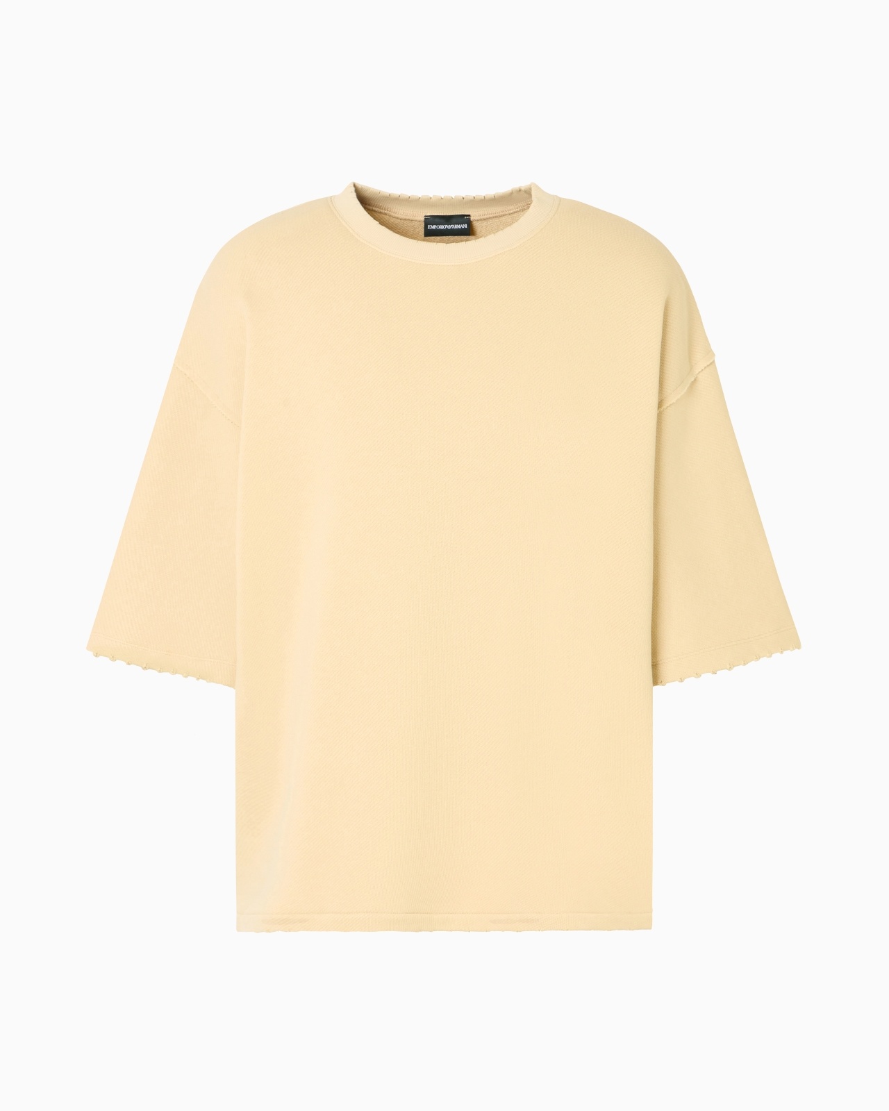 Crew-neck sweatshirt with short wide batwing sleeves, made from soft cotton jersey and featuring special micro cuts at the edges that give the piece a worn look. Jersey Crew neck Short sleeves Used-effect trim Brushed lining Product Code: EM002394AF14793U6205
