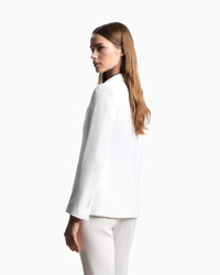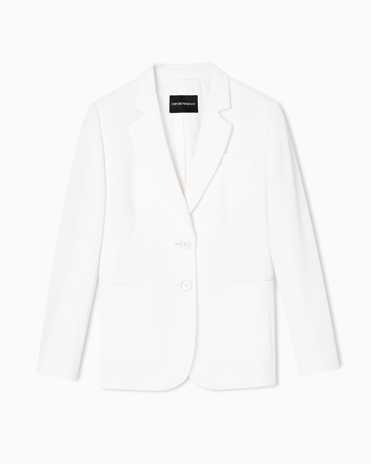 Single-breasted blazer with lapels on the neckline, made of a fabric distinguished by a sophisticated waffle weave with a dense honeycomb-effect motif. The garment is made even more exclusive by its lining with the collection jacquard pattern. The intriguing world of playing cards is the theme running through this season’s women’s collection. The Jeu de Cartes theme is playfully interpreted in different details of the collection: the elegance and refinement of Emporio Armani intertwine with the classic symbols of the playing-card suits, together with intense and vibrant colours that combined with softer shades create looks with a mysterious and sophisticated allure. Fabric: 69% recycled polyester Waffle weave Single-breasted Lapel collar Two-button closure Pocket-square pocket Double-welt side pockets Long sleeves Button cuffs Collection pattern lining Product Code: EW002274AF17481U0006