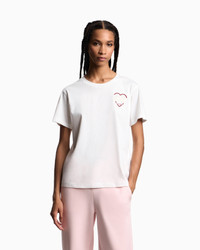 Crew-neck T-shirt in cosy cotton jersey with collection embroidery on the chest with the word “Love” in matching rhinestones. A tribute to the day of love and lovers: the contrasting red graphic designs embellish ready-to-wear clothing and accessories from the Valentine’s Day capsule collection, the Emporio Armani collection that celebrates love. Jersey Crew neck Collection embroidery Rhinestones Short sleeves Product Code: EW002608AF18844U0006