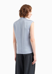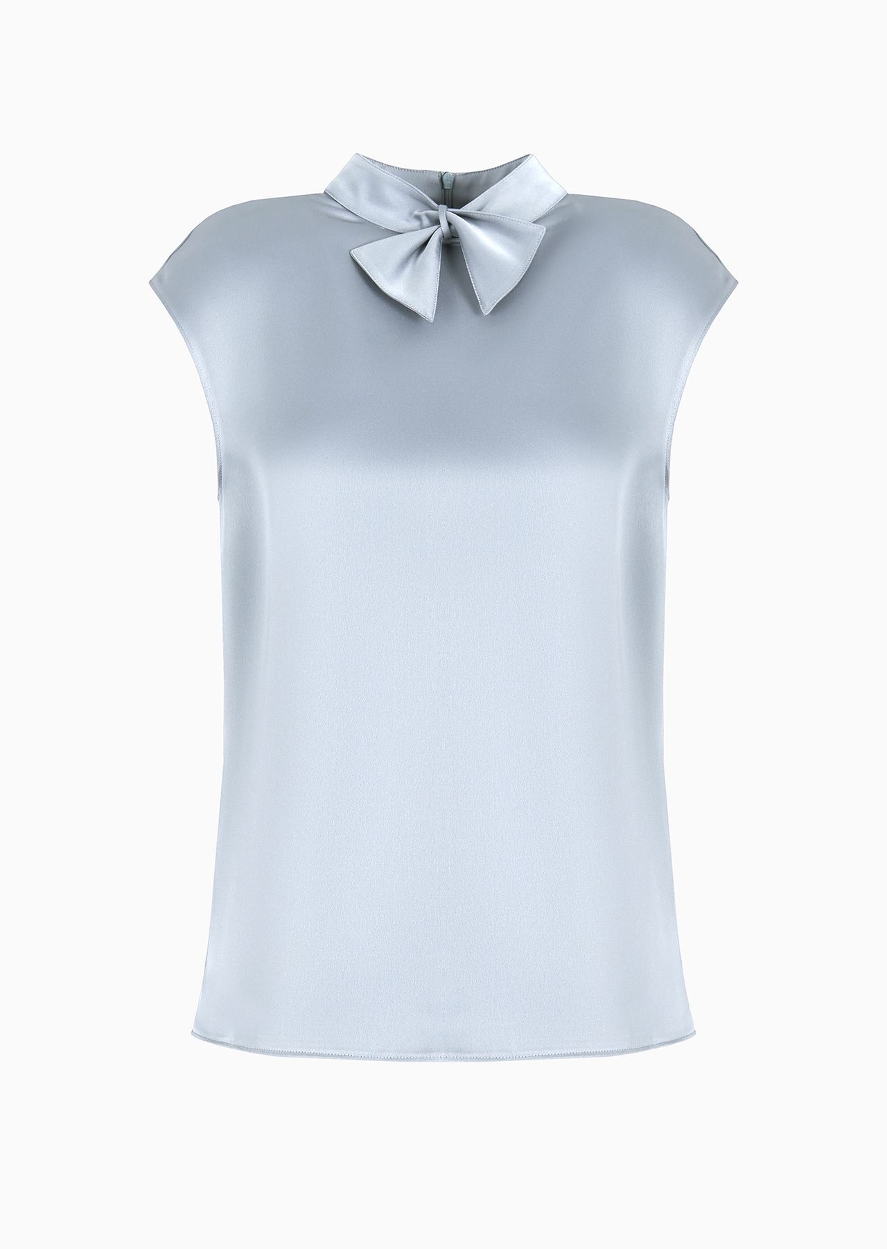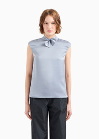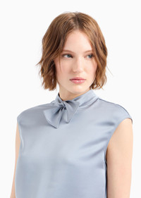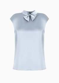 Cap-sleeved blouse made of flowing, shiny satin. The unique collar construction features two edge strips that, once inserted into the buttonhole at the base of the neck, create a bow-tie effect. Product Code: EW000062AF102051U8061 Details Composition 100% Polyester Satin Bow collar Cap sleeves Back concealed zip Fitting The model is 178 cm tall and is wearing size 40/S (Italian Size)
