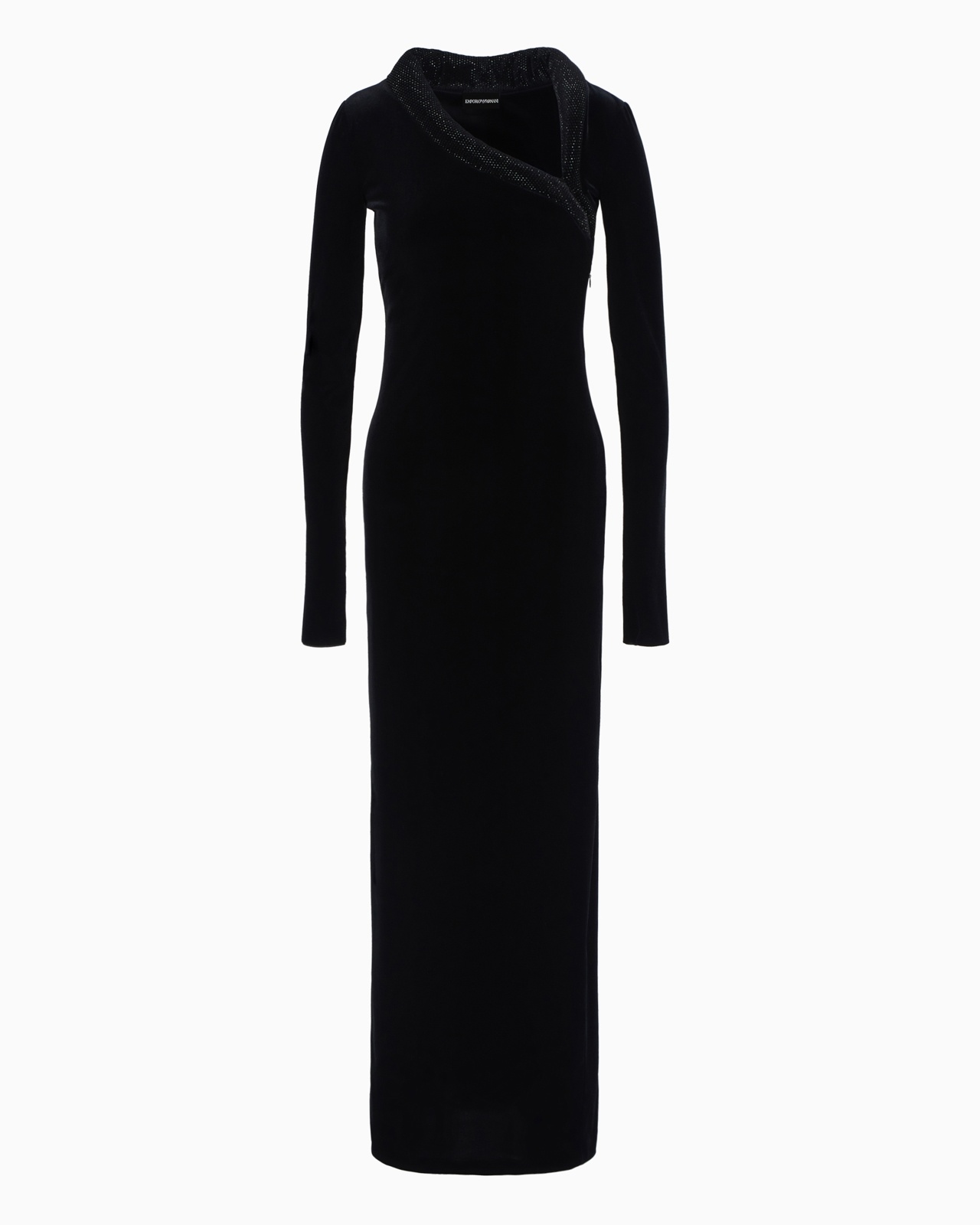 Linear long dress made of combed chenille jersey. The asymmetric front neckline is highlighted by a padded, domed effect covered in matching rhinestones that draws the eye towards the wearer’s face. A feminine shape that creates a rigorous yet sensual image. Length: 144 cm Chenille jersey Padded asymmetric neckline studded with rhinestones Long sleeves Concealed side zip Product Code: 6D2A9F2JW4Z0999
